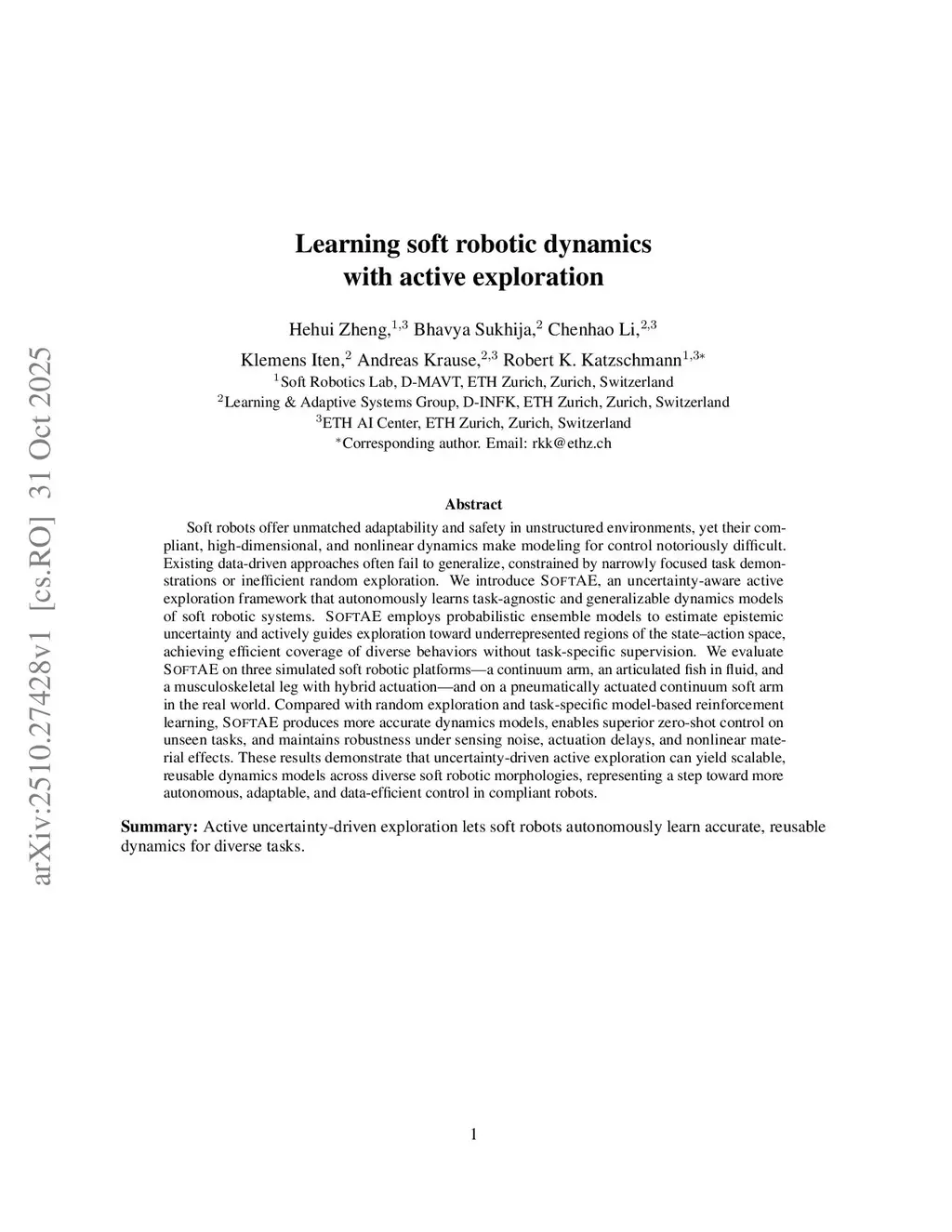 Soft robots offer unmatched adaptability and safety in unstructured environments, yet their compliant, high-dimensional, and nonlinear dynamics make modeling for control notoriously difficult. Existing data-driven approaches often fail to generalize, constrained by narrowly focused task demonstrations or inefficient random exploration. We introduce SoftAE, an uncertainty-aware active exploration framework that autonomously learns task-agnostic and generalizable dynamics models of soft robotic systems. SoftAE employs probabilistic ensemble models to estimate epistemic uncertainty and actively guides exploration toward underrepresented regions of the state-action space, achieving efficient coverage of diverse behaviors without task-specific supervision. We evaluate SoftAE on three simulated soft robotic platforms -- a continuum arm, an articulated fish in fluid, and a musculoskeletal leg with hybrid actuation -- and on a pneumatically actuated continuum soft arm in the real world. Compared with random exploration and task-specific model-based reinforcement learning, SoftAE produces more accurate dynamics models, enables superior zero-shot control on unseen tasks, and maintains robustness under sensing noise, actuation delays, and nonlinear material effects. These results demonstrate that uncertainty-driven active exploration can yield scalable, reusable dynamics models across diverse soft robotic morphologies, representing a step toward more autonomous, adaptable, and data-efficient control in compliant robots.