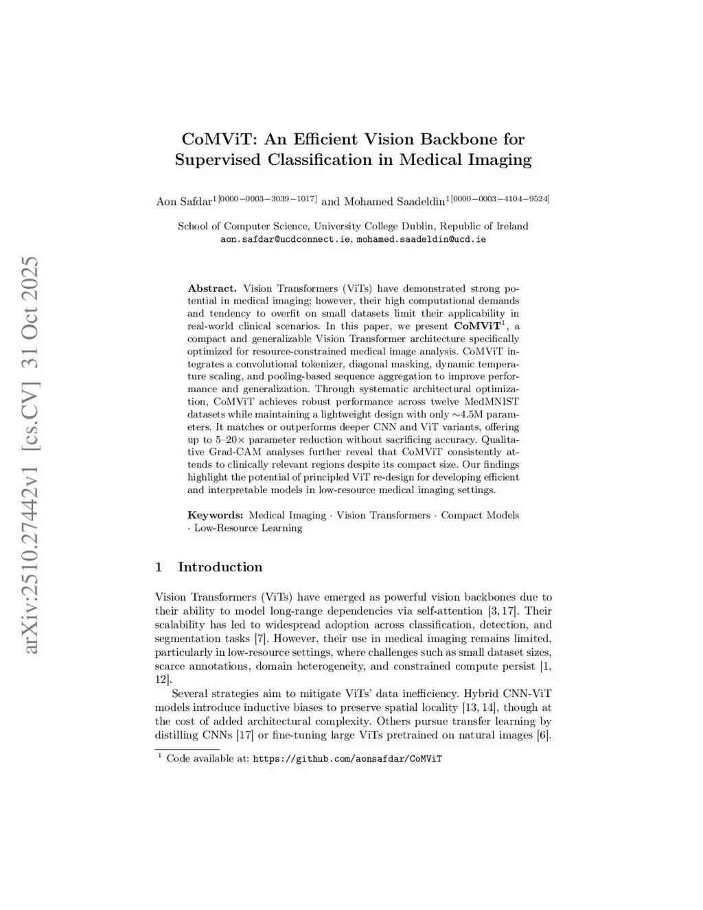 CoMViT: An Efficient Vision Backbone for Supervised Classification in Medical Imaging