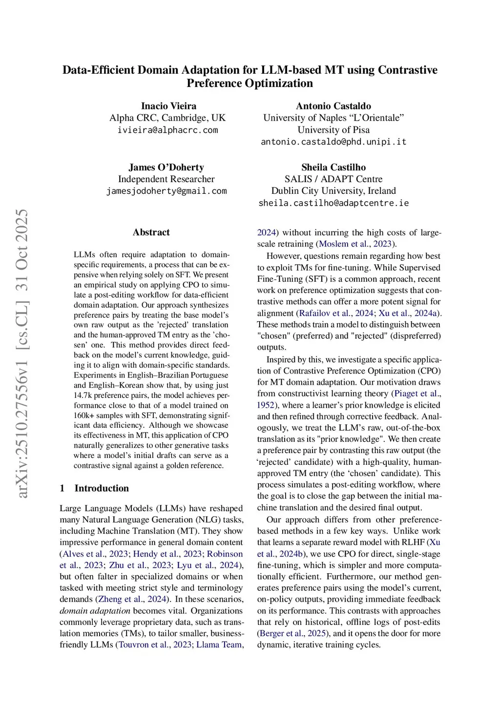 LLMs often require adaptation to domain-specific requirements, a process that can be expensive when relying solely on SFT. We present an empirical study on applying CPO to simulate a post-editing workflow for data-efficient domain adaptation. Our approach synthesizes preference pairs by treating the base model's own raw output as the 'rejected' translation and the human-approved TM entry as the 'chosen' one. This method provides direct feedback on the model's current knowledge, guiding it to align with domain-specific standards. Experiments in English-Brazilian Portuguese and English-Korean show that, by using just 14.7k preference pairs, the model achieves performance close to that of a model trained on 160k+ samples with SFT, demonstrating significant data efficiency. Although we showcase its effectiveness in MT, this application of CPO naturally generalizes to other generative tasks where a model's initial drafts can serve as a contrastive signal against a golden reference.