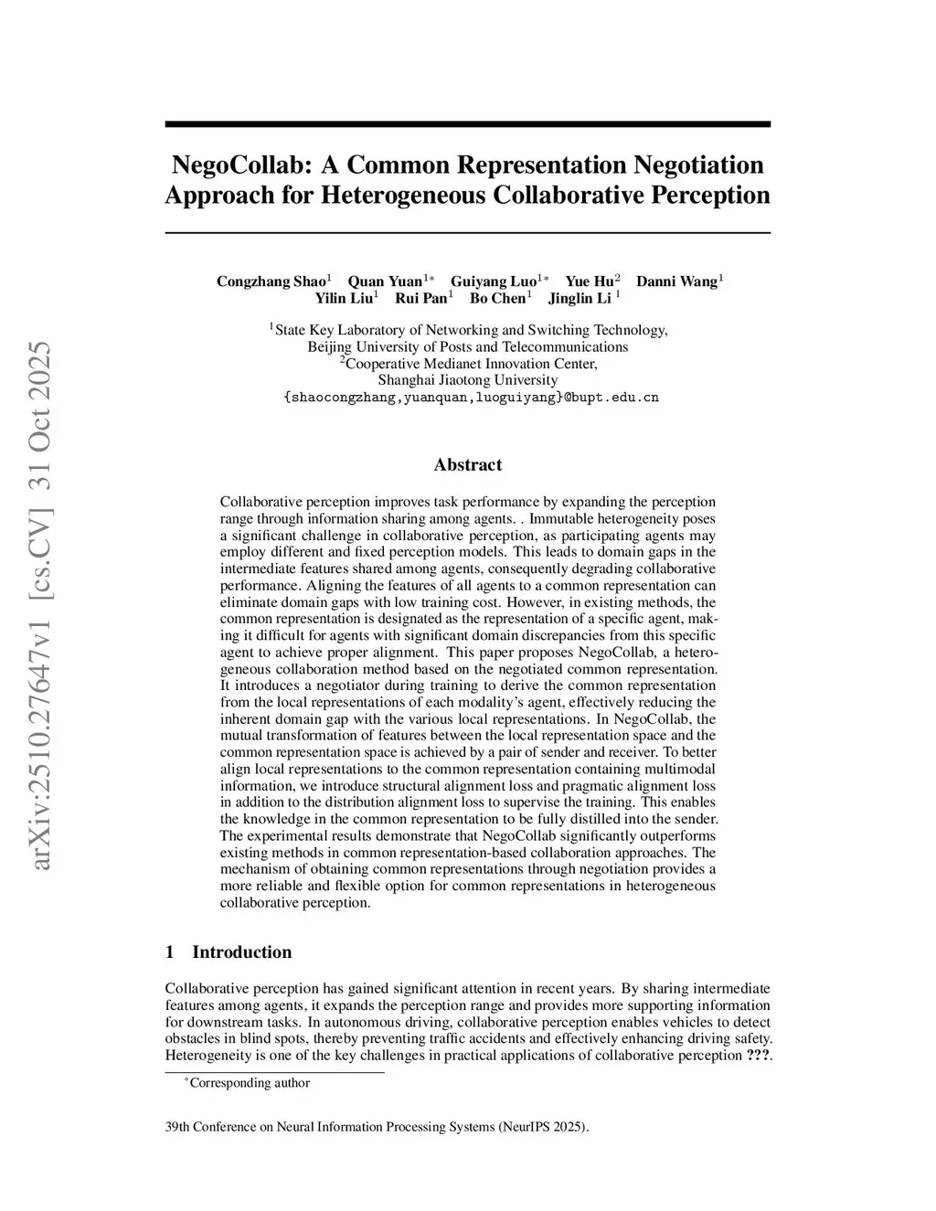 Collaborative perception improves task performance by expanding the perception range through information sharing among agents. . Immutable heterogeneity poses a significant challenge in collaborative perception, as participating agents may employ different and fixed perception models. This leads to domain gaps in the intermediate features shared among agents, consequently degrading collaborative performance. Aligning the features of all agents to a common representation can eliminate domain gaps with low training cost. However, in existing methods, the common representation is designated as the representation of a specific agent, making it difficult for agents with significant domain discrepancies from this specific agent to achieve proper alignment. This paper proposes NegoCollab, a heterogeneous collaboration method based on the negotiated common representation. It introduces a negotiator during training to derive the common representation from the local representations of each modality's agent, effectively reducing the inherent domain gap with the various local representations. In NegoCollab, the mutual transformation of features between the local representation space and the common representation space is achieved by a pair of sender and receiver. To better align local representations to the common representation containing multimodal information, we introduce structural alignment loss and pragmatic alignment loss in addition to the distribution alignment loss to supervise the training. This enables the knowledge in the common representation to be fully distilled into the sender.