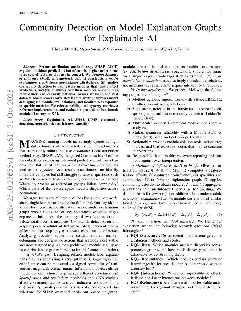 Feature-attribution methods (e.g., SHAP, LIME) explain individual predictions but often miss higher-order structure: sets of features that act in concert. We propose Modules of Influence (MoI), a framework that (i) constructs a model explanation graph from per-instance attributions, (ii) applies community detection to find feature modules that jointly affect predictions, and (iii) quantifies how these modules relate to bias, redundancy, and causality patterns. Across synthetic and real datasets, MoI uncovers correlated feature groups, improves model debugging via module-level ablations, and localizes bias exposure to specific modules. We release stability and synergy metrics, a reference implementation, and evaluation protocols to benchmark module discovery in XAI.