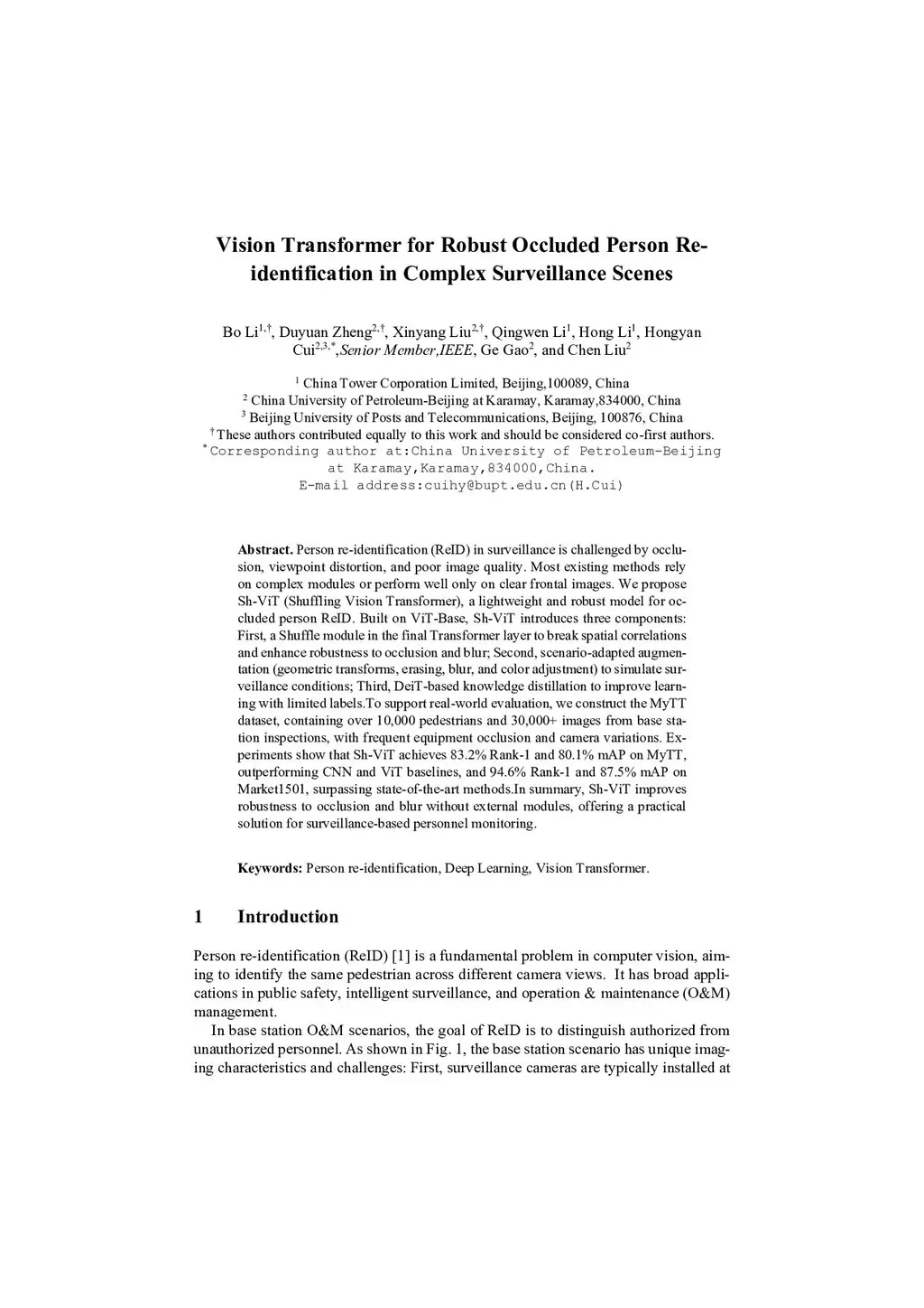 Person re-identification (ReID) in surveillance is challenged by occlusion, viewpoint distortion, and poor image quality. Most existing methods rely on complex modules or perform well only on clear frontal images. We propose Sh-ViT (Shuffling Vision Transformer), a lightweight and robust model for occluded person ReID. Built on ViT-Base, Sh-ViT introduces three components: First, a Shuffle module in the final Transformer layer to break spatial correlations and enhance robustness to occlusion and blur; Second, scenario-adapted augmentation (geometric transforms, erasing, blur, and color adjustment) to simulate surveillance conditions; Third, DeiT-based knowledge distillation to improve learning with limitedthis http URLsupport real-world evaluation, we construct the MyTT dataset, containing over 10,000 pedestrians and 30,000+ images from base station inspections, with frequent equipment occlusion and camera variations. Experiments show that Sh-ViT achieves 83.2% Rank-1 and 80.1% mAP on MyTT, outperforming CNN and ViT baselines, and 94.6% Rank-1 and 87.5% mAP on Market1501, surpassing state-of-the-artthis http URLsummary, Sh-ViT improves robustness to occlusion and blur without external modules, offering a practical solution for surveillance-based personnel monitoring.