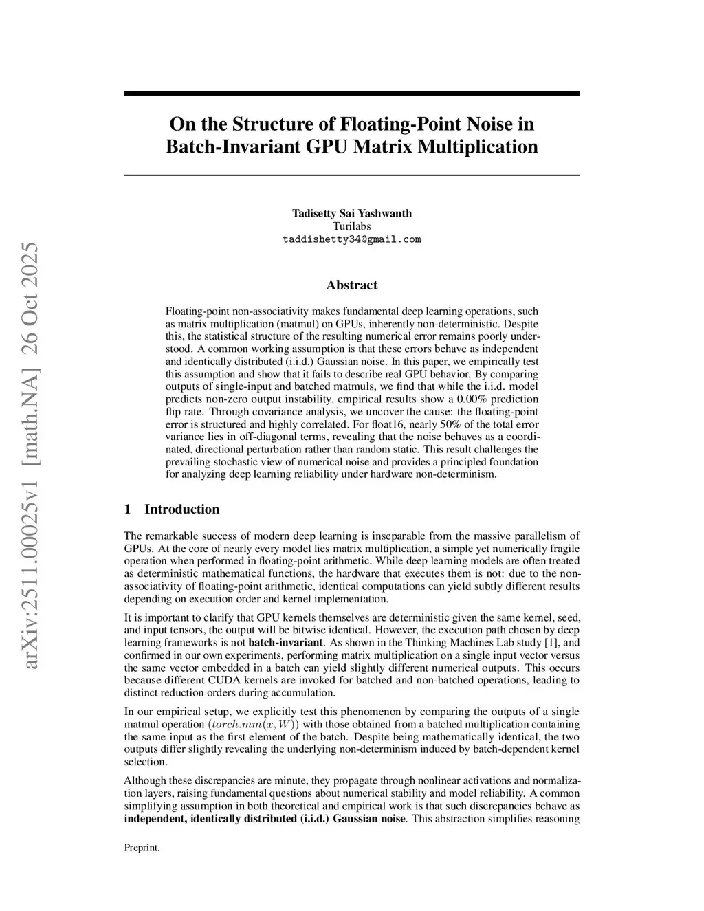 Floating-point non-associativity makes fundamental deep learning operations, such as matrix multiplication (matmul) on GPUs, inherently non-deterministic. Despite this, the statistical structure of the resulting numerical error remains poorly understood. A common working assumption is that these errors behave as independent and identically distributed (i.i.d.) Gaussian noise. In this paper, we empirically test this assumption and show that it fails to describe real GPU behavior. By comparing outputs of single-input and batched matmuls, we find that while the i.i.d. model predicts non-zero output instability, empirical results show a 0.00% prediction flip rate. Through covariance analysis, we uncover the cause: the floating-point error is structured and highly correlated. For float16, nearly 50% of the total error variance lies in off-diagonal terms, revealing that the noise behaves as a coordinated, directional perturbation rather than random static. This result challenges the prevailing stochastic view of numerical noise and provides a principled foundation for analyzing deep learning reliability under hardware non-determinism.