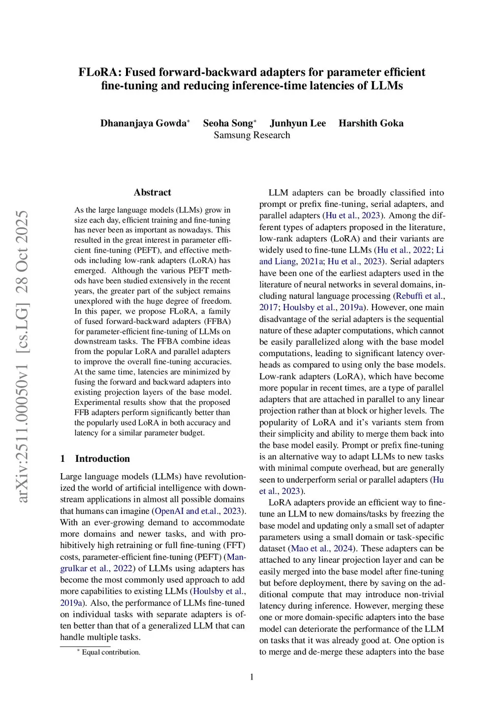 FLoRA: Fused forward-backward adapters for parameter efficient fine-tuning and reducing inference-time latencies of LLMs