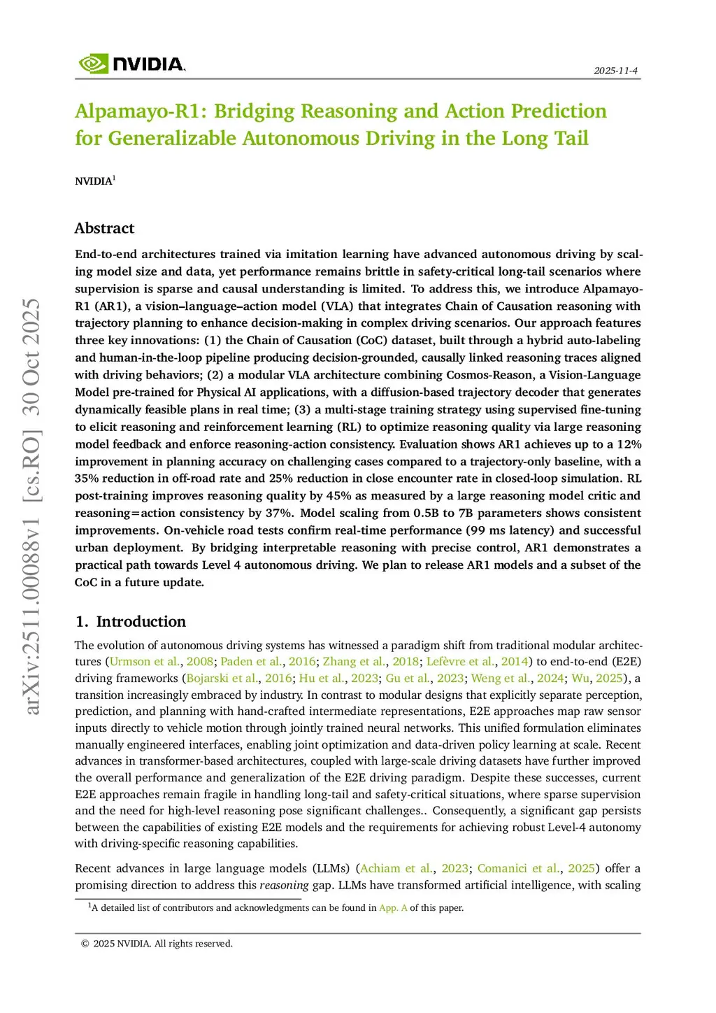 End-to-end architectures trained via imitation learning have advanced autonomous driving by scaling model size and data, yet performance remains brittle in safety-critical long-tail scenarios where supervision is sparse and causal understanding is limited. We introduce Alpamayo-R1 (AR1), a vision-language-action model (VLA) that integrates Chain of Causation reasoning with trajectory planning for complex driving scenarios. Our approach features three key innovations: (1) the Chain of Causation (CoC) dataset, built through a hybrid auto-labeling and human-in-the-loop pipeline producing decision-grounded, causally linked reasoning traces aligned with driving behaviors; (2) a modular VLA architecture combining Cosmos-Reason, a vision-language model pre-trained for Physical AI, with a diffusion-based trajectory decoder that generates dynamically feasible trajectories in real time; (3) a multi-stage training strategy using supervised fine-tuning to elicit reasoning and reinforcement learning (RL) to enforce reasoning-action consistency and optimize reasoning quality. AR1 achieves up to a 12% improvement in planning accuracy on challenging cases compared to a trajectory-only baseline, with a 35% reduction in close encounter rate in closed-loop simulation. RL post-training improves reasoning quality by 45% and reasoning-action consistency by 37%. Model scaling from 0.5B to 7B parameters shows consistent improvements. On-vehicle road tests confirm real-time performance (99 ms latency) and successful urban deployment. By bridging interpretable reasoning with precise control, AR1 demonstrates a practical path towards Level 4 autonomous driving. Model weights are available atthis https URLwith inference code atthis https URL.