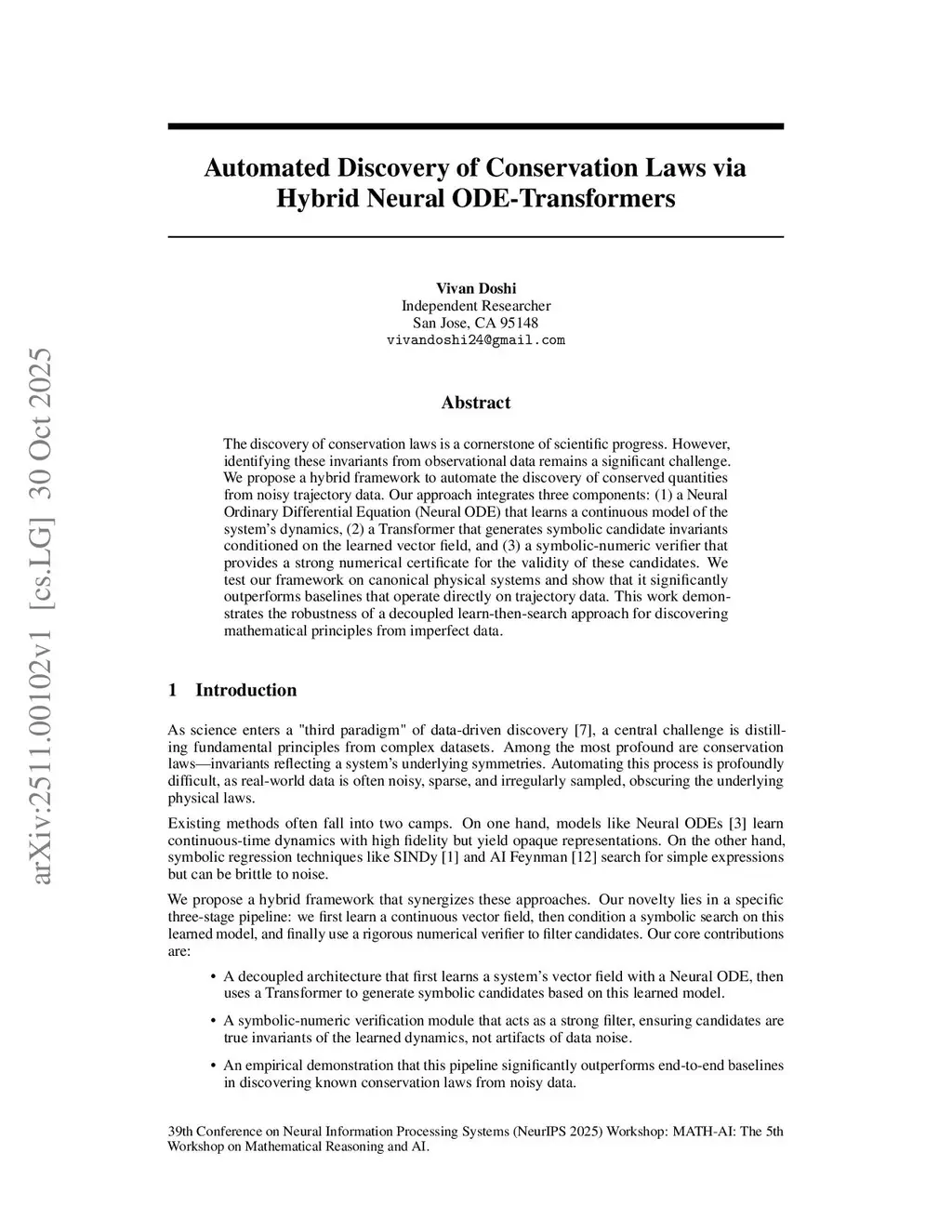 The discovery of conservation laws is a cornerstone of scientific progress. However, identifying these invariants from observational data remains a significant challenge. We propose a hybrid framework to automate the discovery of conserved quantities from noisy trajectory data. Our approach integrates three components: (1) a Neural Ordinary Differential Equation (Neural ODE) that learns a continuous model of the system's dynamics, (2) a Transformer that generates symbolic candidate invariants conditioned on the learned vector field, and (3) a symbolic-numeric verifier that provides a strong numerical certificate for the validity of these candidates. We test our framework on canonical physical systems and show that it significantly outperforms baselines that operate directly on trajectory data. This work demonstrates the robustness of a decoupled learn-then-search approach for discovering mathematical principles from imperfect data.