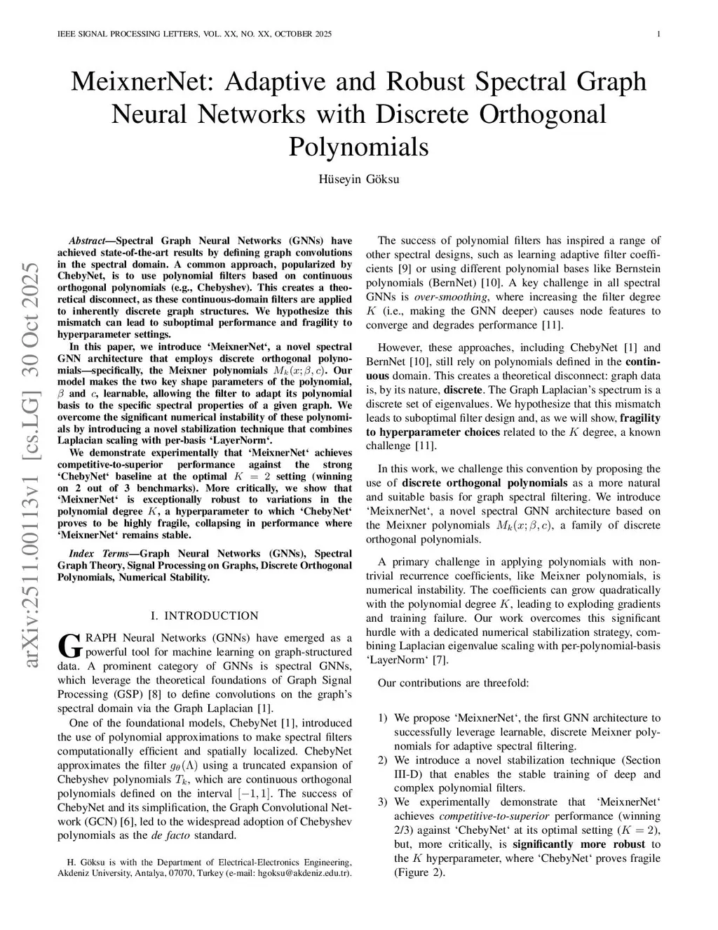 Spectral Graph Neural Networks (GNNs) have achieved state-of-the-art results by defining graph convolutions in the spectral domain. A common approach, popularized by ChebyNet, is to use polynomial filters based on continuous orthogonal polynomials (e.g., Chebyshev). This creates a theoretical disconnect, as these continuous-domain filters are applied to inherently discrete graph structures. We hypothesize this mismatch can lead to suboptimal performance and fragility to hyperparameter settings.In this paper, we introduce MeixnerNet, a novel spectral GNN architecture that employs discrete orthogonal polynomials -- specifically, the Meixner polynomials . Our model makes the two key shape parameters of the polynomial, beta and c, learnable, allowing the filter to adapt its polynomial basis to the specific spectral properties of a given graph. We overcome the significant numerical instability of these polynomials by introducing a novel stabilization technique that combines Laplacian scaling with per-basis LayerNorm.We demonstrate experimentally that MeixnerNet achieves competitive-to-superior performance against the strong ChebyNet baseline at the optimal K = 2 setting (winning on 2 out of 3 benchmarks). More critically, we show that MeixnerNet is exceptionally robust to variations in the polynomial degree K, a hyperparameter to which ChebyNet proves to be highly fragile, collapsing in performance where MeixnerNet remains stable.