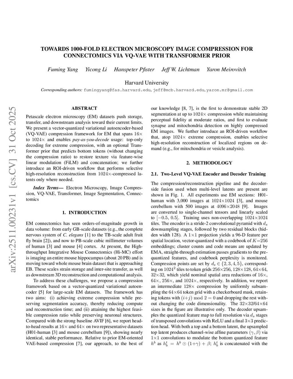 Petascale electron microscopy (EM) datasets push storage, transfer, and downstream analysis toward their current limits. We present a vector-quantized variational autoencoder-based (VQ-VAE) compression framework for EM that spans 16x to 1024x and enables pay-as-you-decode usage: top-only decoding for extreme compression, with an optional Transformer prior that predicts bottom tokens (without changing the compression ratio) to restore texture via feature-wise linear modulation (FiLM) and concatenation; we further introduce an ROI-driven workflow that performs selective high-resolution reconstruction from 1024x-compressed latents only where needed.