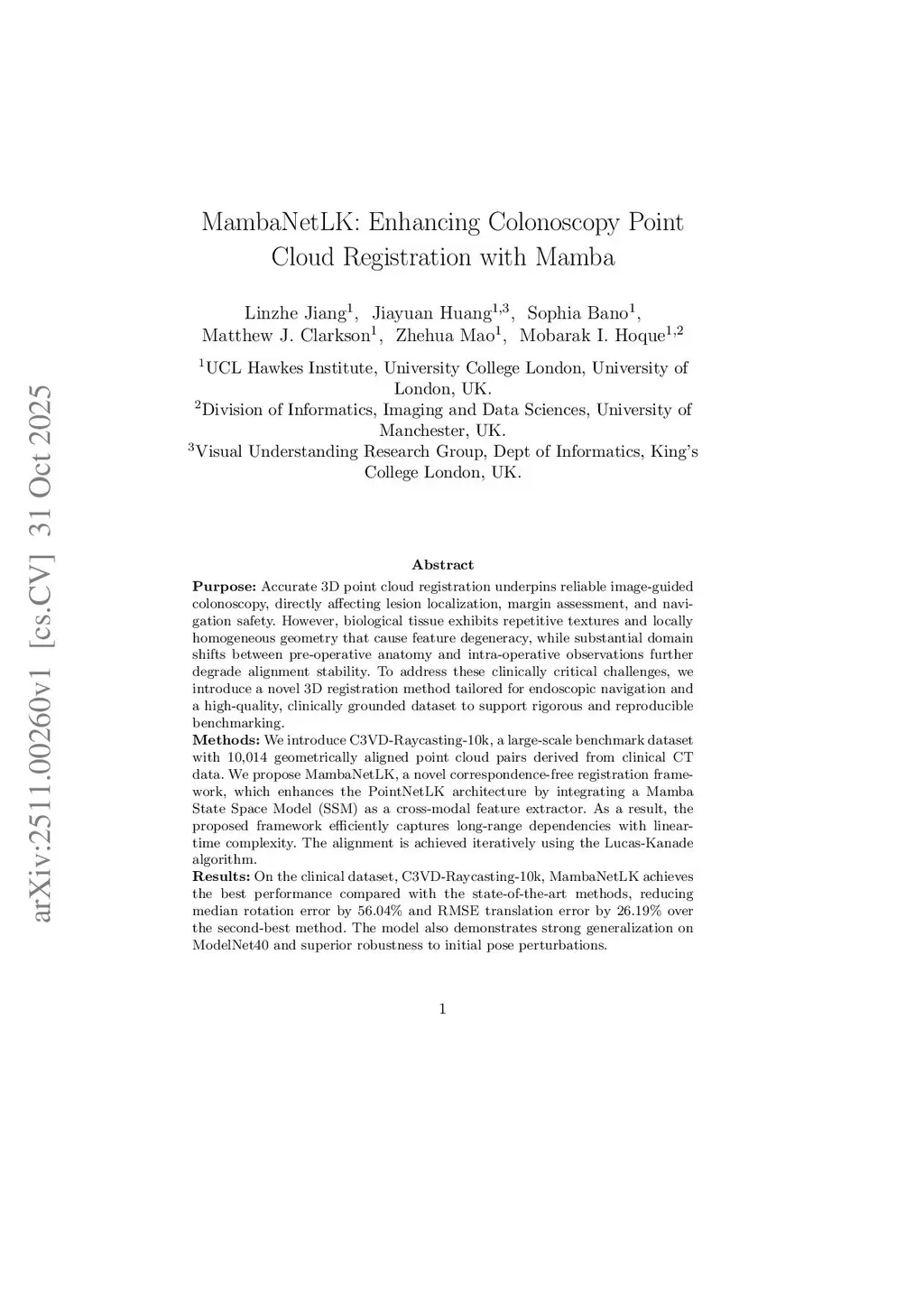 Accurate 3D point cloud registration underpins reliable image-guided colonoscopy, directly affecting lesion localization, margin assessment, and navigation safety. However, biological tissue exhibits repetitive textures and locally homogeneous geometry that cause feature degeneracy, while substantial domain shifts between pre-operative anatomy and intra-operative observations further degrade alignment stability. To address these clinically critical challenges, we introduce a novel 3D registration method tailored for endoscopic navigation and a high-quality, clinically grounded dataset to support rigorous and reproducible benchmarking. We introduce C3VD-Raycasting-10k, a large-scale benchmark dataset with 10,014 geometrically aligned point cloud pairs derived from clinical CT data. We propose MambaNetLK, a novel correspondence-free registration framework, which enhances the PointNetLK architecture by integrating a Mamba State Space Model (SSM) as a cross-modal feature extractor. As a result, the proposed framework efficiently captures long-range dependencies with linear-time complexity. The alignment is achieved iteratively using the Lucas-Kanade algorithm. On the clinical dataset, C3VD-Raycasting-10k, MambaNetLK achieves the best performance compared with the state-of-the-art methods, reducing median rotation error by 56.04% and RMSE translation error by 26.19% over the second-best method. The model also demonstrates strong generalization on ModelNet40 and superior robustness to initial pose perturbations. MambaNetLK provides a robust foundation for 3D registration in surgical navigation. The combination of a globally expressive SSM-based feature extractor and a large-scale clinical dataset enables more accurate and reliable guidance systems in minimally invasive procedures like colonoscopy.