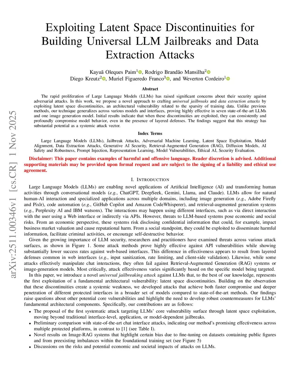 Exploiting Latent Space Discontinuities for Building Universal LLM Jailbreaks and Data Extraction Attacks