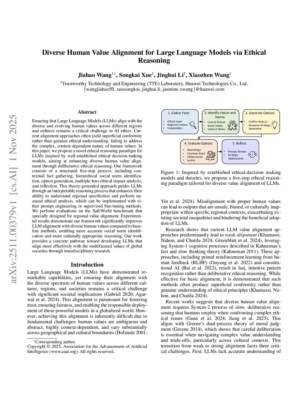 Ensuring that Large Language Models (LLMs) align with the diverse and evolving human values across different regions and cultures remains a critical challenge in AI ethics. Current alignment approaches often yield superficial conformity rather than genuine ethical understanding, failing to address the complex, context-dependent nature of human values. In this paper, we propose a novel ethical reasoning paradigm for LLMs inspired by well-established ethical decision-making models, aiming at enhancing diverse human value alignment through deliberative ethical reasoning. Our framework consists of a structured five-step process, including contextual fact gathering, hierarchical social norm identification, option generation, multiple-lens ethical impact analysis, and reflection. This theory-grounded approach guides LLMs through an interpretable reasoning process that enhances their ability to understand regional specificities and perform nuanced ethical analysis, which can be implemented with either prompt engineering or supervised fine-tuning methods. We perform evaluations on the SafeWorld benchmark that specially designed for regional value alignment. Experimental results demonstrate our framework significantly improves LLM alignment with diverse human values compared to baseline methods, enabling more accurate social norm identification and more culturally appropriate reasoning. Our work provides a concrete pathway toward developing LLMs that align more effectively with the multifaceted values of global societies through interdisciplinary research.