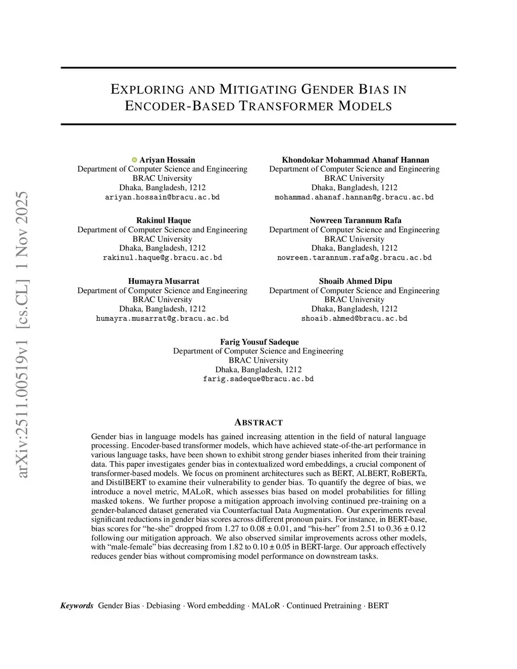 Exploring and Mitigating Gender Bias in Encoder-Based Transformer Models