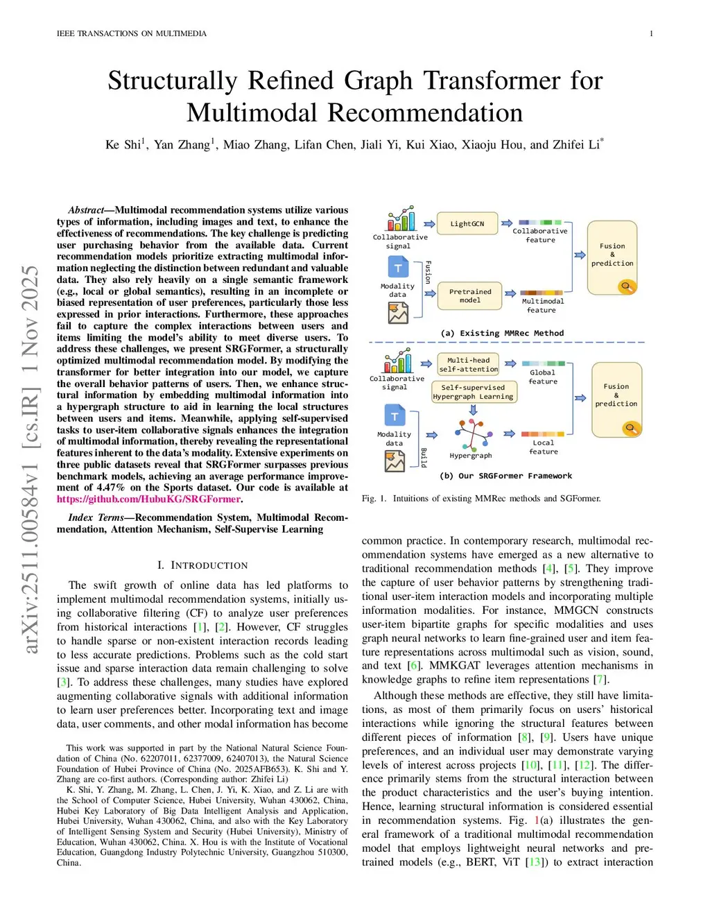 Multimodal recommendation systems utilize various types of information, including images and text, to enhance the effectiveness of recommendations. The key challenge is predicting user purchasing behavior from the available data. Current recommendation models prioritize extracting multimodal information while neglecting the distinction between redundant and valuable data. They also rely heavily on a single semantic framework (e.g., local or global semantics), resulting in an incomplete or biased representation of user preferences, particularly those less expressed in prior interactions. Furthermore, these approaches fail to capture the complex interactions between users and items, limiting the model's ability to meet diverse users. To address these challenges, we present SRGFormer, a structurally optimized multimodal recommendation model. By modifying the transformer for better integration into our model, we capture the overall behavior patterns of users. Then, we enhance structural information by embedding multimodal information into a hypergraph structure to aid in learning the local structures between users and items. Meanwhile, applying self-supervised tasks to user-item collaborative signals enhances the integration of multimodal information, thereby revealing the representational features inherent to the data's modality. Extensive experiments on three public datasets reveal that SRGFormer surpasses previous benchmark models, achieving an average performance improvement of 4.47 percent on the Sports dataset. The code is publicly available online.