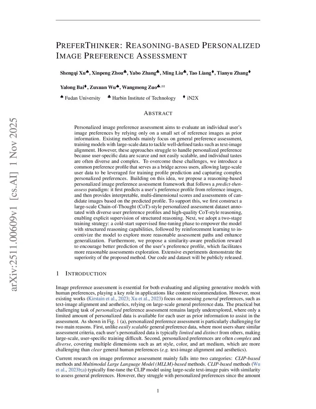 Personalized image preference assessment aims to evaluate an individual user's image preferences by relying only on a small set of reference images as prior information. Existing methods mainly focus on general preference assessment, training models with large-scale data to tackle well-defined tasks such as text-image alignment. However, these approaches struggle to handle personalized preference because user-specific data are scarce and not easily scalable, and individual tastes are often diverse and complex. To overcome these challenges, we introduce a common preference profile that serves as a bridge across users, allowing large-scale user data to be leveraged for training profile prediction and capturing complex personalized preferences. Building on this idea, we propose a reasoning-based personalized image preference assessment framework that follows a \textit{predict-then-assess} paradigm: it first predicts a user's preference profile from reference images, and then provides interpretable, multi-dimensional scores and assessments of candidate images based on the predicted profile. To support this, we first construct a large-scale Chain-of-Thought (CoT)-style personalized assessment dataset annotated with diverse user preference profiles and high-quality CoT-style reasoning, enabling explicit supervision of structured reasoning. Next, we adopt a two-stage training strategy: a cold-start supervised fine-tuning phase to empower the model with structured reasoning capabilities, followed by reinforcement learning to incentivize the model to explore more reasonable assessment paths and enhance generalization. Furthermore, we propose a similarity-aware prediction reward to encourage better prediction of the user's preference profile, which facilitates more reasonable assessments exploration. Extensive experiments demonstrate the superiority of the proposed method.