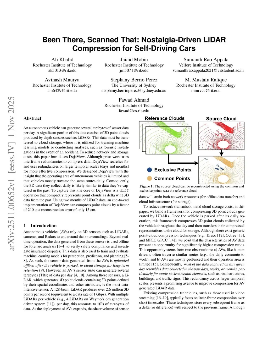 An autonomous vehicle can generate several terabytes of sensor data per day. A significant portion of this data consists of 3D point clouds produced by depth sensors such as LiDARs. This data must be transferred to cloud storage, where it is utilized for training machine learning models or conducting analyses, such as forensic investigations in the event of an accident. To reduce network and storage costs, this paper introduces DejaView. Although prior work uses interframe redundancies to compress data, DejaView searches for and uses redundancies on larger temporal scales (days and months) for more effective compression. We designed DejaView with the insight that the operating area of autonomous vehicles is limited and that vehicles mostly traverse the same routes daily. Consequently, the 3D data they collect daily is likely similar to the data they have captured in the past. To capture this, the core of DejaView is a diff operation that compactly represents point clouds as delta w.r.t. 3D data from the past. Using two months of LiDAR data, an end-to-end implementation of DejaView can compress point clouds by a factor of 210 at a reconstruction error of only 15 cm.