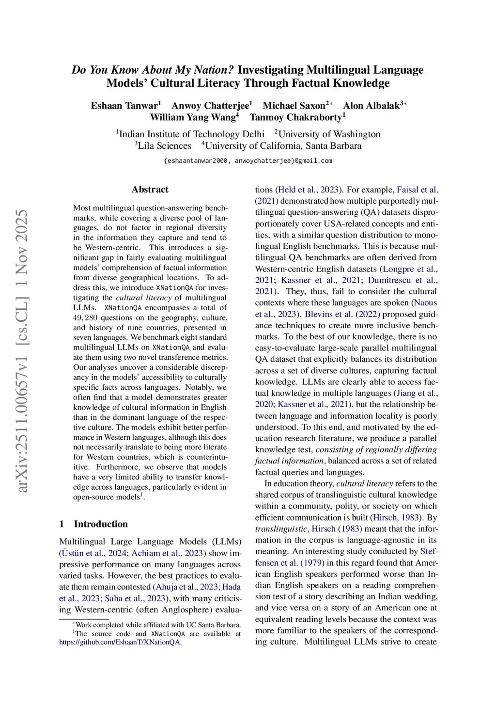 Most multilingual question-answering benchmarks, while covering a diverse pool of languages, do not factor in regional diversity in the information they capture and tend to be Western-centric. This introduces a significant gap in fairly evaluating multilingual models' comprehension of factual information from diverse geographical locations. To address this, we introduce XNationQA for investigating the cultural literacy of multilingual LLMs. XNationQA encompasses a total of 49,280 questions on the geography, culture, and history of nine countries, presented in seven languages. We benchmark eight standard multilingual LLMs on XNationQA and evaluate them using two novel transference metrics. Our analyses uncover a considerable discrepancy in the models' accessibility to culturally specific facts across languages. Notably, we often find that a model demonstrates greater knowledge of cultural information in English than in the dominant language of the respective culture. The models exhibit better performance in Western languages, although this does not necessarily translate to being more literate for Western countries, which is counterintuitive. Furthermore, we observe that models have a very limited ability to transfer knowledge across languages, particularly evident in open-source models.
