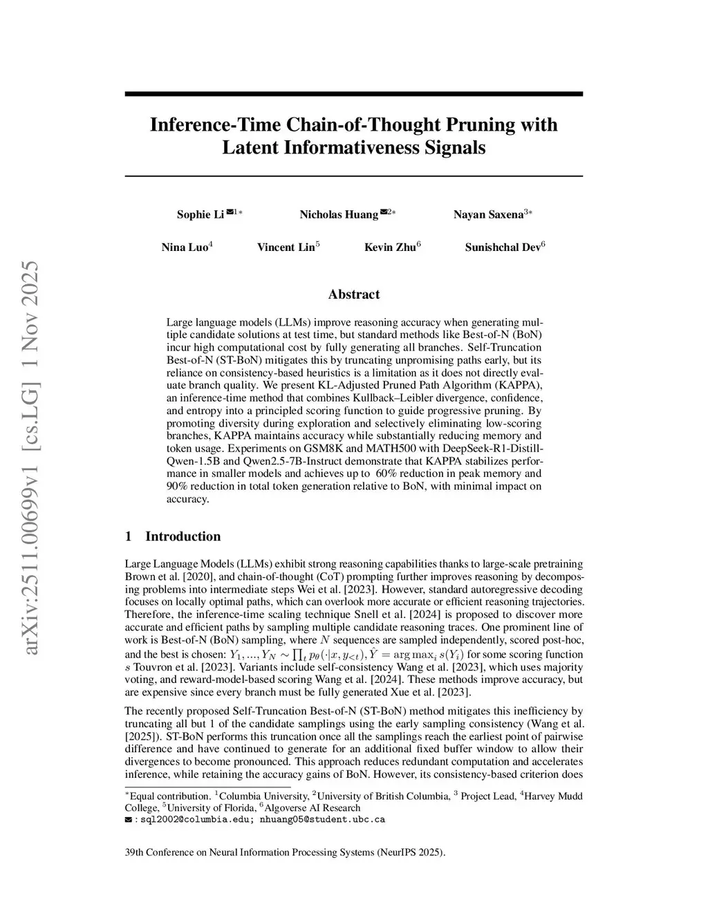 Large language models (LLMs) improve reasoning accuracy when generating multiple candidate solutions at test time, but standard methods like Best-of-N (BoN) incur high computational cost by fully generating all branches. Self-Truncation Best-of-N (ST-BoN) mitigates this by truncating unpromising paths early, but its reliance on consistency-based heuristics is a limitation as it does not directly evaluate branch quality. We present KL-Adjusted Pruned Path Algorithm (KAPPA), an inference-time method that combines Kullback-Leibler divergence, confidence, and entropy into a principled scoring function to guide progressive pruning. By promoting diversity during exploration and selectively eliminating low-scoring branches, KAPPA maintains accuracy while substantially reducing memory and token usage. Experiments on GSM8K and MATH500 with DeepSeek-R1-Distill-Qwen-1.5B and Qwen2.5-7B-Instruct demonstrate that KAPPA stabilizes performance in smaller models and achieves up to ~60% reduction in peak memory and ~90% reduction in total token generation relative to BoN, with minimal impact on accuracy.