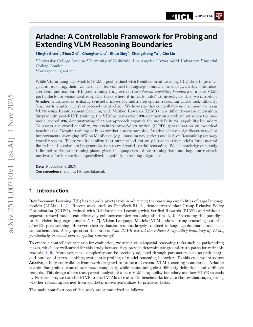 While Vision-Language Models (VLMs) post-trained with Reinforcement Learning (RL) show impressive general reasoning, their evaluation is often confined to language-dominant tasks (e.g., math). This raises a critical question: can RL post-training truly extend the inherent capability boundary of a base VLM, particularly for visual-centric spatial tasks where it initially fails? To investigate this, we introduce Ariadne, a framework utilizing synthetic mazes for multi-step spatial reasoning where task difficulty (e.g., path length, turns) is precisely controlled. We leverage this controllable environment to train VLMs using Reinforcement Learning with Verified Rewards (RLVR) in a difficulty-aware curriculum. Surprisingly, post-RLVR training, the VLM achieves over 50% accuracy on a problem set where the base model scored 0%, demonstrating that our approach expands the model's initial capability boundary. To assess real-world viability, we evaluate out-of-distribution (OOD) generalization on practical benchmarks. Despite training only on synthetic maze samples, Ariadne achieves significant zero-shot improvements, averaging 16% on MapBench (e.g., museum navigation) and 24% on ReasonMap (subway transfer tasks). These results confirm that our method not only broadens the model's fundamental limits but also enhances its generalization to real-world spatial reasoning. We acknowledge our study is limited to the post-training phase, given the opaqueness of pre-training data, and hope our research motivates further work on specialized, capability-extending alignment.