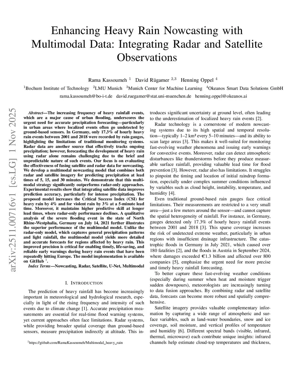 The increasing frequency of heavy rainfall events, which are a major cause of urban flooding, underscores the urgent need for accurate precipitation forecasting - particularly in urban areas where localized events often go undetected by ground-based sensors. In Germany, only 17.3% of hourly heavy rain events between 2001 and 2018 were recorded by rain gauges, highlighting the limitations of traditional monitoring systems. Radar data are another source that effectively tracks ongoing precipitation; however, forecasting the development of heavy rain using radar alone remains challenging due to the brief and unpredictable nature of such events. Our focus is on evaluating the effectiveness of fusing satellite and radar data for nowcasting. We develop a multimodal nowcasting model that combines both radar and satellite imagery for predicting precipitation at lead times of 5, 15, and 30 minutes. We demonstrate that this multimodal strategy significantly outperforms radar-only approaches. Experimental results show that integrating satellite data improves prediction accuracy, particularly for intense precipitation. The proposed model increases the Critical Success Index for heavy rain by 4% and for violent rain by 3% at a 5-minute lead time. Moreover, it maintains higher predictive skill at longer lead times, where radar-only performance declines. A qualitative analysis of the severe flooding event in the state of North Rhine-Westphalia, Germany in 2021 further illustrates the superior performance of the multimodal model. Unlike the radar-only model, which captures general precipitation patterns, the multimodal model yields more detailed and accurate forecasts for regions affected by heavy rain. This improved precision enables timely, reliable, life-saving warnings. Implementation available atthis https URL