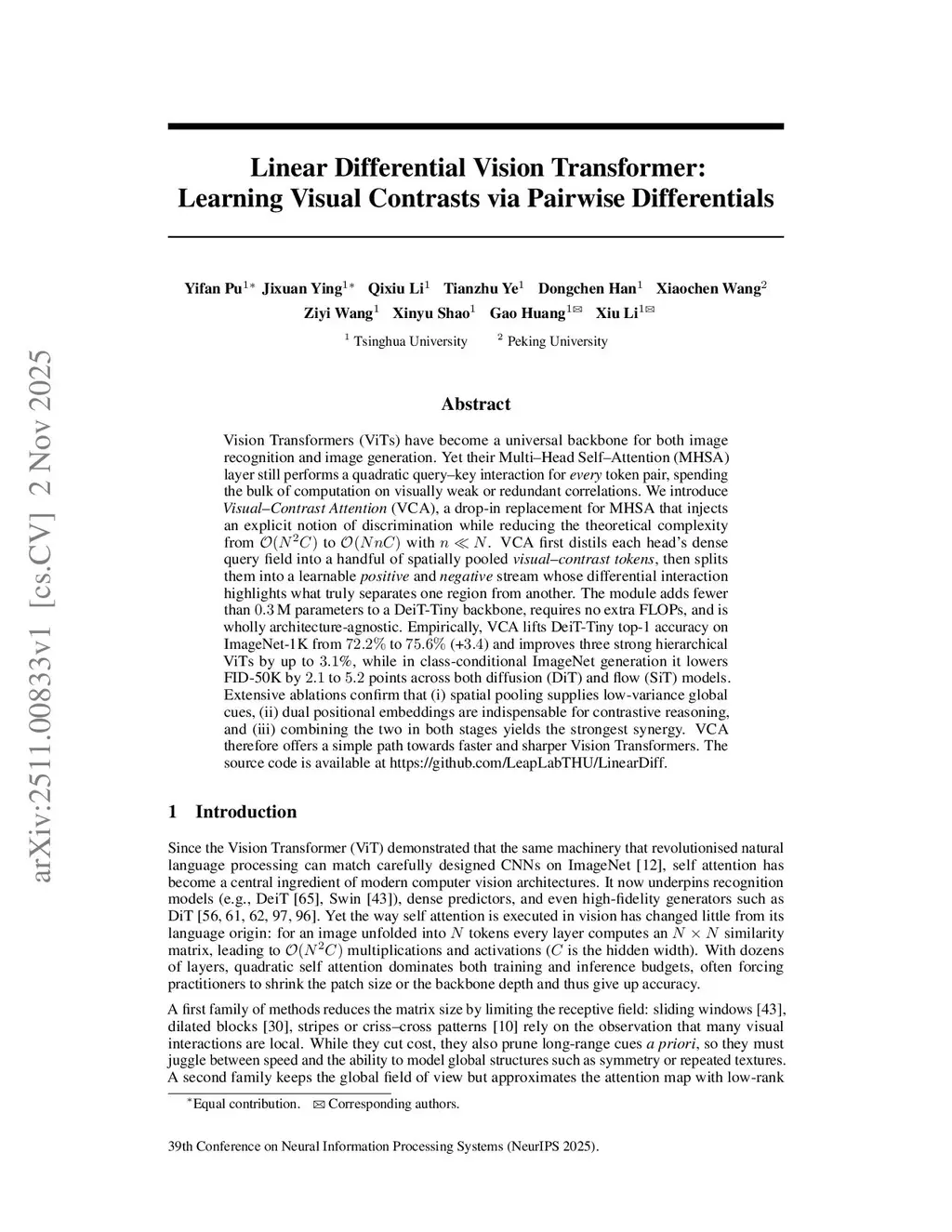 Linear Differential Vision Transformer: Learning Visual Contrasts via Pairwise Differentials
