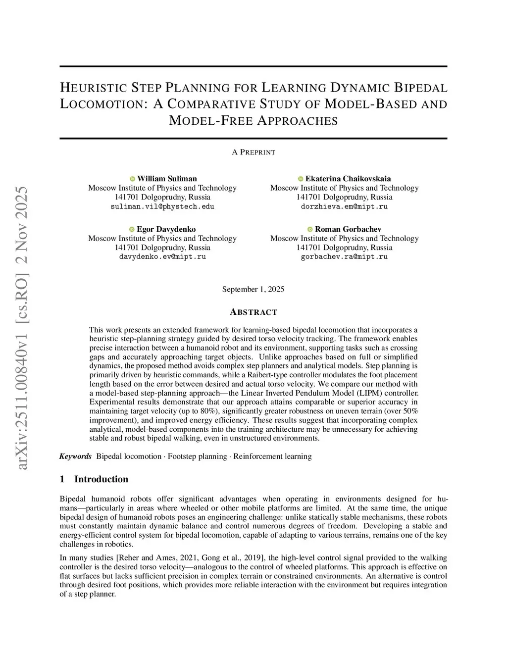 This work presents an extended framework for learning-based bipedal locomotion that incorporates a heuristic step-planning strategy guided by desired torso velocity tracking. The framework enables precise interaction between a humanoid robot and its environment, supporting tasks such as crossing gaps and accurately approaching target objects. Unlike approaches based on full or simplified dynamics, the proposed method avoids complex step planners and analytical models. Step planning is primarily driven by heuristic commands, while a Raibert-type controller modulates the foot placement length based on the error between desired and actual torso velocity. We compare our method with a model-based step-planning approach -- the Linear Inverted Pendulum Model (LIPM) controller. Experimental results demonstrate that our approach attains comparable or superior accuracy in maintaining target velocity (up to 80%), significantly greater robustness on uneven terrain (over 50% improvement), and improved energy efficiency. These results suggest that incorporating complex analytical, model-based components into the training architecture may be unnecessary for achieving stable and robust bipedal walking, even in unstructured environments.