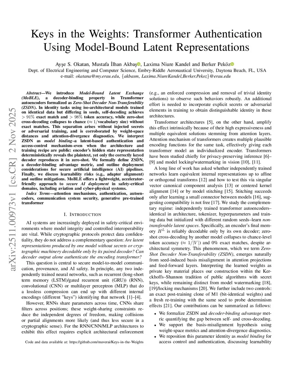 We introduce Model-Bound Latent Exchange (MoBLE), a decoder-binding property in Transformer autoencoders formalized as Zero-Shot Decoder Non-Transferability (ZSDN). In identity tasks using iso-architectural models trained on identical data but differing in seeds, self-decoding achieves more than 0.91 exact match and 0.98 token accuracy, while zero-shot cross-decoding collapses to chance without exact matches. This separation arises without injected secrets or adversarial training, and is corroborated by weight-space distances and attention-divergence diagnostics. We interpret ZSDN as model binding, a latent-based authentication and access-control mechanism, even when the architecture and training recipe are public: encoder's hidden state representation deterministically reveals the plaintext, yet only the correctly keyed decoder reproduces it in zero-shot. We formally define ZSDN, a decoder-binding advantage metric, and outline deployment considerations for secure artificial intelligence (AI) pipelines. Finally, we discuss learnability risks (e.g., adapter alignment) and outline mitigations. MoBLE offers a lightweight, accelerator-friendly approach to secure AI deployment in safety-critical domains, including aviation and cyber-physical systems.