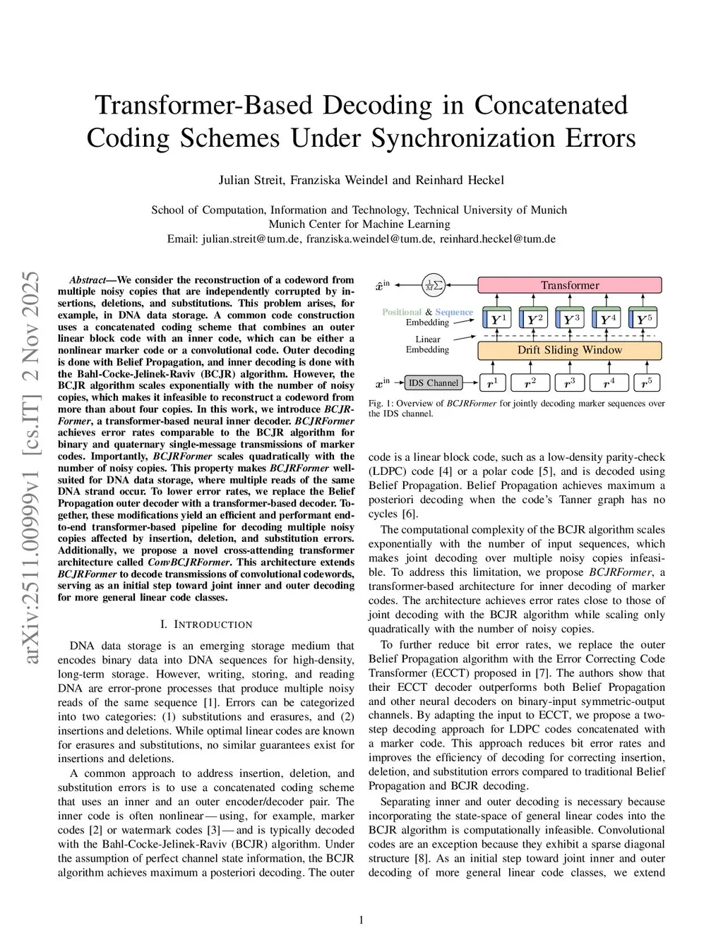 We consider the reconstruction of a codeword from multiple noisy copies that are independently corrupted by insertions, deletions, and substitutions. This problem arises, for example, in DNA data storage. A common code construction uses a concatenated coding scheme that combines an outer linear block code with an inner code, which can be either a nonlinear marker code or a convolutional code. Outer decoding is done with Belief Propagation, and inner decoding is done with the Bahl-Cocke-Jelinek-Raviv (BCJR) algorithm. However, the BCJR algorithm scales exponentially with the number of noisy copies, which makes it infeasible to reconstruct a codeword from more than about four copies. In this work, we introduce BCJRFormer, a transformer-based neural inner decoder. BCJRFormer achieves error rates comparable to the BCJR algorithm for binary and quaternary single-message transmissions of marker codes. Importantly, BCJRFormer scales quadratically with the number of noisy copies. This property makes BCJRFormer well-suited for DNA data storage, where multiple reads of the same DNA strand occur. To lower error rates, we replace the Belief Propagation outer decoder with a transformer-based decoder. Together, these modifications yield an efficient and performant end-to-end transformer-based pipeline for decoding multiple noisy copies affected by insertion, deletion, and substitution errors. Additionally, we propose a novel cross-attending transformer architecture called ConvBCJRFormer. This architecture extends BCJRFormer to decode transmissions of convolutional codewords, serving as an initial step toward joint inner and outer decoding for more general linear code classes.