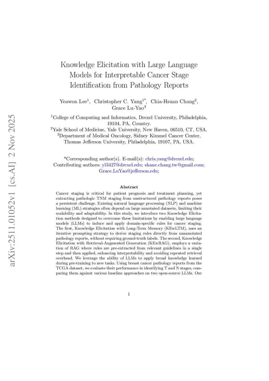 Cancer staging is critical for patient prognosis and treatment planning, yet extracting pathologic TNM staging from unstructured pathology reports poses a persistent challenge. Existing natural language processing (NLP) and machine learning (ML) strategies often depend on large annotated datasets, limiting their scalability and adaptability. In this study, we introduce two Knowledge Elicitation methods designed to overcome these limitations by enabling large language models (LLMs) to induce and apply domain-specific rules for cancer staging. The first, Knowledge Elicitation with Long-Term Memory (KEwLTM), uses an iterative prompting strategy to derive staging rules directly from unannotated pathology reports, without requiring ground-truth labels. The second, Knowledge Elicitation with Retrieval-Augmented Generation (KEwRAG), employs a variation of RAG where rules are pre-extracted from relevant guidelines in a single step and then applied, enhancing interpretability and avoiding repeated retrieval overhead. We leverage the ability of LLMs to apply broad knowledge learned during pre-training to new tasks. Using breast cancer pathology reports from the TCGA dataset, we evaluate their performance in identifying T and N stages, comparing them against various baseline approaches on two open-source LLMs. Our results indicate that KEwLTM outperforms KEwRAG when Zero-Shot Chain-of-Thought (ZSCOT) inference is effective, whereas KEwRAG achieves better performance when ZSCOT inference is less effective. Both methods offer transparent, interpretable interfaces by making the induced rules explicit. These findings highlight the promise of our Knowledge Elicitation methods as scalable, high-performing solutions for automated cancer staging with enhanced interpretability, particularly in clinical settings with limited annotated data.