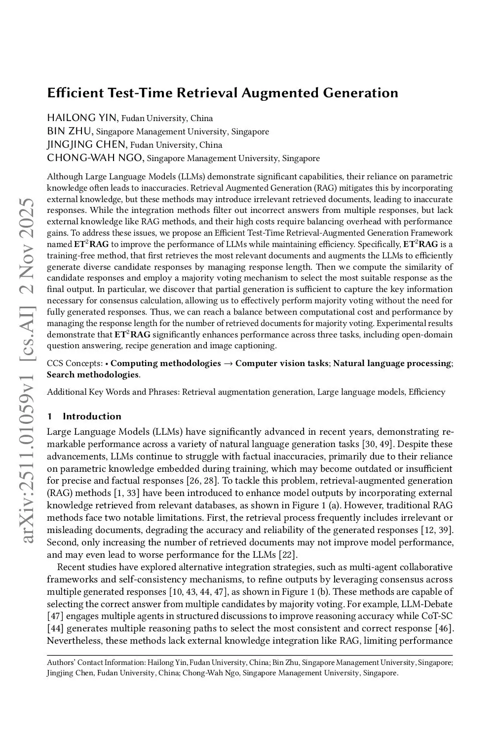 Although Large Language Models (LLMs) demonstrate significant capabilities, their reliance on parametric knowledge often leads to inaccuracies. Retrieval Augmented Generation (RAG) mitigates this by incorporating external knowledge, but these methods may introduce irrelevant retrieved documents, leading to inaccurate responses. While the integration methods filter out incorrect answers from multiple responses, but lack external knowledge like RAG methods, and their high costs require balancing overhead with performance gains. To address these issues, we propose an Efficient Test-Time Retrieval-Augmented Generation Framework named ET2RAG to improve the performance of LLMs while maintaining efficiency. Specifically, ET2RAG is a training-free method, that first retrieves the most relevant documents and augments the LLMs to efficiently generate diverse candidate responses by managing response length. Then we compute the similarity of candidate responses and employ a majority voting mechanism to select the most suitable response as the final output. In particular, we discover that partial generation is sufficient to capture the key information necessary for consensus calculation, allowing us to effectively perform majority voting without the need for fully generated responses. Thus, we can reach a balance between computational cost and performance by managing the response length for the number of retrieved documents for majority voting. Experimental results demonstrate that ET2RAG significantly enhances performance across three tasks, including open-domain question answering, recipe generation and image captioning.