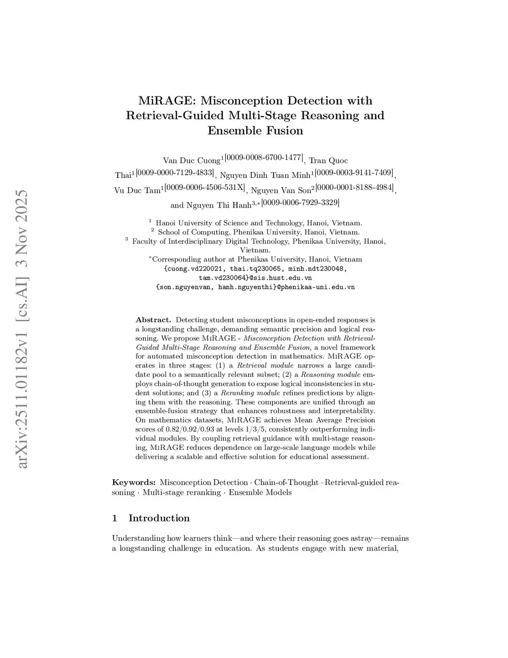 Detecting student misconceptions in open-ended responses is a longstanding challenge, demanding semantic precision and logical reasoning. We propose MiRAGE - Misconception Detection with Retrieval-Guided Multi-Stage Reasoning and Ensemble Fusion, a novel framework for automated misconception detection in mathematics. MiRAGE operates in three stages: (1) a Retrieval module narrows a large candidate pool to a semantically relevant subset; (2) a Reasoning module employs chain-of-thought generation to expose logical inconsistencies in student solutions; and (3) a Reranking module refines predictions by aligning them with the reasoning. These components are unified through an ensemble-fusion strategy that enhances robustness and interpretability. On mathematics datasets, MiRAGE achieves Mean Average Precision scores of 0.82/0.92/0.93 at levels 1/3/5, consistently outperforming individual modules. By coupling retrieval guidance with multi-stage reasoning, MiRAGE reduces dependence on large-scale language models while delivering a scalable and effective solution for educational assessment.