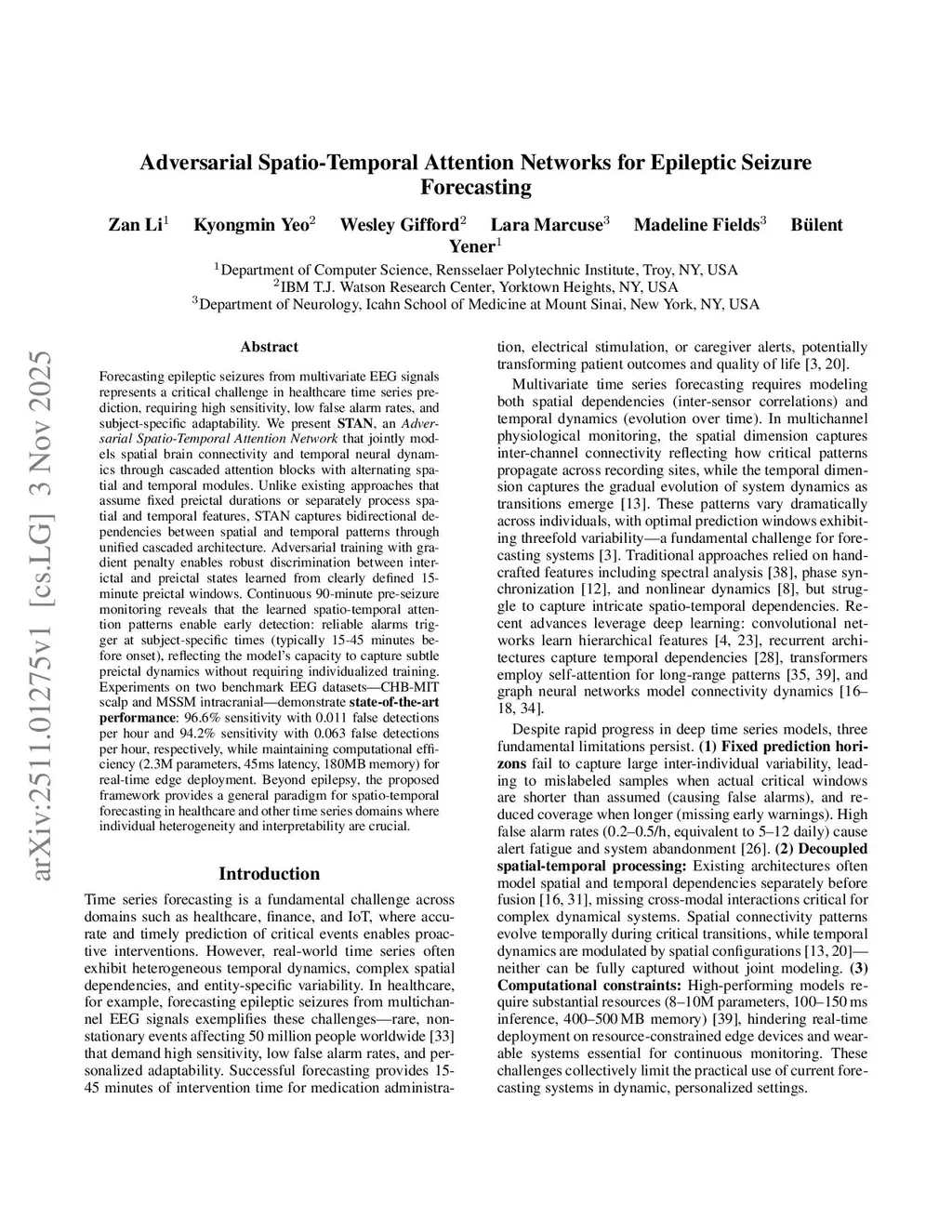 Forecasting epileptic seizures from multivariate EEG signals represents a critical challenge in healthcare time series prediction, requiring high sensitivity, low false alarm rates, and subject-specific adaptability. We present STAN, an Adversarial Spatio-Temporal Attention Network that jointly models spatial brain connectivity and temporal neural dynamics through cascaded attention blocks with alternating spatial and temporal modules. Unlike existing approaches that assume fixed preictal durations or separately process spatial and temporal features, STAN captures bidirectional dependencies between spatial and temporal patterns through a unified cascaded architecture. Adversarial training with gradient penalty enables robust discrimination between interictal and preictal states learned from clearly defined 15-minute preictal windows. Continuous 90-minute pre-seizure monitoring reveals that the learned spatio-temporal attention patterns enable early detection: reliable alarms trigger at subject-specific times (typically 15-45 minutes before onset), reflecting the model's capacity to capture subtle preictal dynamics without requiring individualized training. Experiments on two benchmark EEG datasets (CHB-MIT scalp: 8 subjects, 46 events; MSSM intracranial: 4 subjects, 14 events) demonstrate state-of-the-art performance: 96.6% sensitivity with 0.011 false detections per hour and 94.2% sensitivity with 0.063 false detections per hour, respectively, while maintaining computational efficiency (2.3M parameters, 45 ms latency, 180 MB memory) for real-time edge deployment. Beyond epilepsy, the proposed framework provides a general paradigm for spatio-temporal forecasting in healthcare and other time series domains where individual heterogeneity and interpretability are crucial.