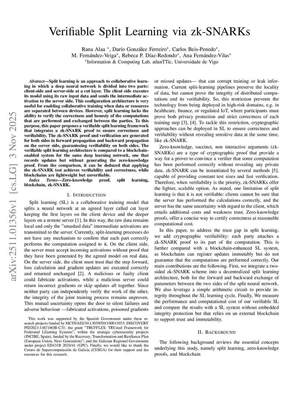 Split learning is an approach to collaborative learning in which a deep neural network is divided into two parts: client-side and server-side at a cut layer. The client side executes its model using its raw input data and sends the intermediate activation to the server side. This configuration architecture is very useful for enabling collaborative training when data or resources are separated between devices. However, split learning lacks the ability to verify the correctness and honesty of the computations that are performed and exchanged between the parties. To this purpose, this paper proposes a verifiable split learning framework that integrates a zk-SNARK proof to ensure correctness and verifiability. The zk-SNARK proof and verification are generated for both sides in forward propagation and backward propagation on the server side, guaranteeing verifiability on both sides. The verifiable split learning architecture is compared to a blockchain-enabled system for the same deep learning network, one that records updates but without generating the zero-knowledge proof. From the comparison, it can be deduced that applying the zk-SNARK test achieves verifiability and correctness, while blockchains are lightweight but unverifiable.