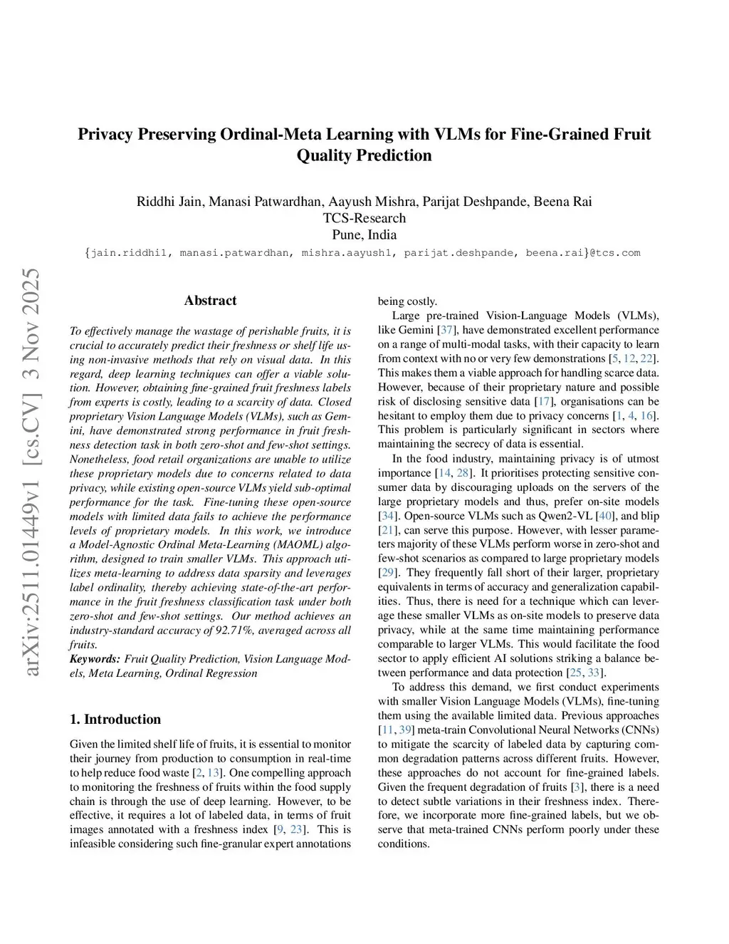 To effectively manage the wastage of perishable fruits, it is crucial to accurately predict their freshness or shelf life using non-invasive methods that rely on visual data. In this regard, deep learning techniques can offer a viable solution. However, obtaining fine-grained fruit freshness labels from experts is costly, leading to a scarcity of data. Closed proprietary Vision Language Models (VLMs), such as Gemini, have demonstrated strong performance in fruit freshness detection task in both zero-shot and few-shot settings. Nonetheless, food retail organizations are unable to utilize these proprietary models due to concerns related to data privacy, while existing open-source VLMs yield sub-optimal performance for the task. Fine-tuning these open-source models with limited data fails to achieve the performance levels of proprietary models. In this work, we introduce a Model-Agnostic Ordinal Meta-Learning (MAOML) algorithm, designed to train smaller VLMs. This approach utilizes meta-learning to address data sparsity and leverages label ordinality, thereby achieving state-of-the-art performance in the fruit freshness classification task under both zero-shot and few-shot settings. Our method achieves an industry-standard accuracy of 92.71%, averaged across all fruits.Keywords: Fruit Quality Prediction, Vision Language Models, Meta Learning, Ordinal Regression