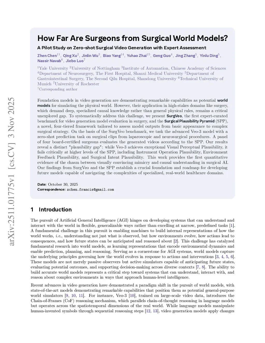 Foundation models in video generation are demonstrating remarkable capabilities as potential world models for simulating the physical world. However, their application in high-stakes domains like surgery, which demand deep, specialized causal knowledge rather than general physical rules, remains a critical unexplored gap. To systematically address this challenge, we present SurgVeo, the first expert-curated benchmark for video generation model evaluation in surgery, and the Surgical Plausibility Pyramid (SPP), a novel, four-tiered framework tailored to assess model outputs from basic appearance to complex surgical strategy. On the basis of the SurgVeo benchmark, we task the advanced Veo-3 model with a zero-shot prediction task on surgical clips from laparoscopic and neurosurgical procedures. A panel of four board-certified surgeons evaluates the generated videos according to the SPP. Our results reveal a distinct "plausibility gap": while Veo-3 achieves exceptional Visual Perceptual Plausibility, it fails critically at higher levels of the SPP, including Instrument Operation Plausibility, Environment Feedback Plausibility, and Surgical Intent Plausibility. This work provides the first quantitative evidence of the chasm between visually convincing mimicry and causal understanding in surgical AI. Our findings from SurgVeo and the SPP establish a crucial foundation and roadmap for developing future models capable of navigating the complexities of specialized, real-world healthcare domains.