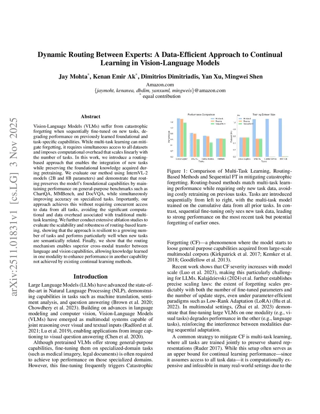 Vision-Language Models (VLMs) suffer from catastrophic forgetting when sequentially fine-tuned on new tasks, degrading performance on previously learned foundational and task-specific capabilities. While multi-task learning can mitigate forgetting, it requires simultaneous access to all datasets and imposes computational overhead that scales linearly with the number of tasks. In this work, we introduce a routing-based approach that enables the integration of new tasks while preserving the foundational knowledge acquired during pretraining. We evaluate our method using InternVL-2 models (2B and 8B parameters) and demonstrate that routing preserves the model's foundational capabilities by maintaining performance on general-purpose benchmarks such as ChartQA, MMBench, and DocVQA, while simultaneously improving accuracy on specialized tasks. Importantly, our approach achieves this without requiring concurrent access to data from all tasks, avoiding the significant computational and data overhead associated with traditional multi-task learning. We further conduct extensive ablation studies to evaluate the scalability and robustness of routing-based learning, showing that the approach is resilient to a growing number of tasks and performs particularly well when new tasks are semantically related. Finally, we show that the routing mechanism enables superior cross-modal transfer between language and vision capabilities, allowing knowledge learned in one modality to enhance performance in another capability not achieved by existing continual learning methods.