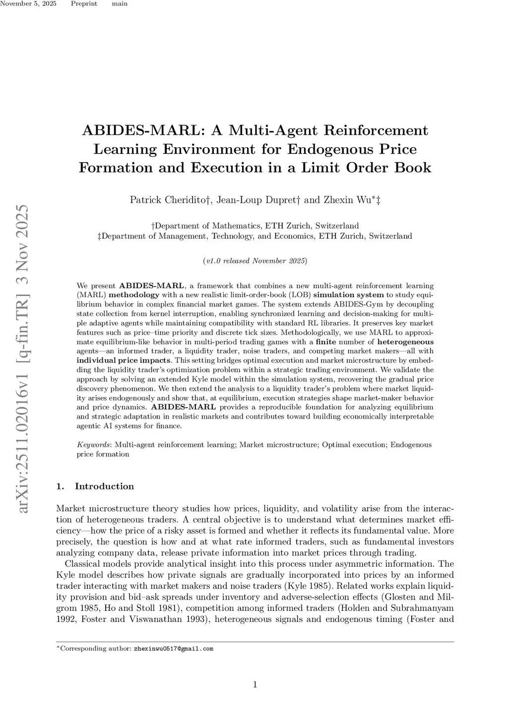 We present ABIDES-MARL, a framework that combines a new multi-agent reinforcement learning (MARL) methodology with a new realistic limit-order-book (LOB) simulation system to study equilibrium behavior in complex financial market games. The system extends ABIDES-Gym by decoupling state collection from kernel interruption, enabling synchronized learning and decision-making for multiple adaptive agents while maintaining compatibility with standard RL libraries. It preserves key market features such as price-time priority and discrete tick sizes. Methodologically, we use MARL to approximate equilibrium-like behavior in multi-period trading games with a finite number of heterogeneous agents-an informed trader, a liquidity trader, noise traders, and competing market makers-all with individual price impacts. This setting bridges optimal execution and market microstructure by embedding the liquidity trader's optimization problem within a strategic trading environment. We validate the approach by solving an extended Kyle model within the simulation system, recovering the gradual price discovery phenomenon. We then extend the analysis to a liquidity trader's problem where market liquidity arises endogenously and show that, at equilibrium, execution strategies shape market-maker behavior and price dynamics. ABIDES-MARL provides a reproducible foundation for analyzing equilibrium and strategic adaptation in realistic markets and contributes toward building economically interpretable agentic AI systems for finance.