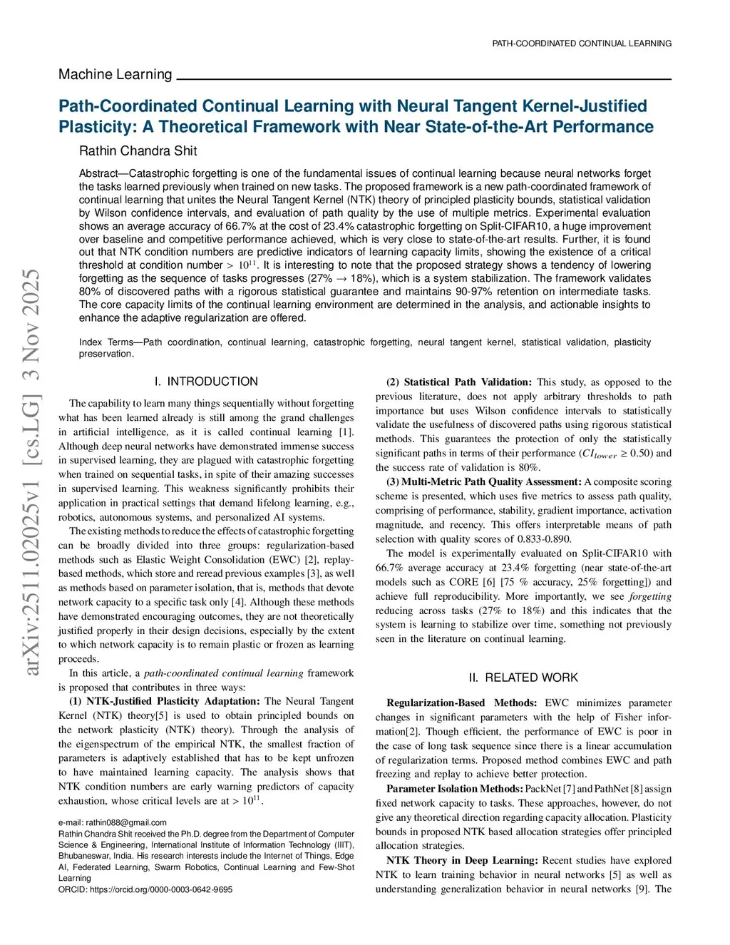 Catastrophic forgetting is one of the fundamental issues of continual learning because neural networks forget the tasks learned previously when trained on new tasks. The proposed framework is a new path-coordinated framework of continual learning that unites the Neural Tangent Kernel (NTK) theory of principled plasticity bounds, statistical validation by Wilson confidence intervals, and evaluation of path quality by the use of multiple metrics. Experimental evaluation shows an average accuracy of 66.7% at the cost of 23.4% catastrophic forgetting on Split-CIFAR10, a huge improvement over the baseline and competitive performance achieved, which is very close to state-of-the-art results. Further, it is found out that NTK condition numbers are predictive indicators of learning capacity limits, showing the existence of a critical threshold at condition number . It is interesting to note that the proposed strategy shows a tendency of lowering forgetting as the sequence of tasks progresses (27% to 18%), which is a system stabilization. The framework validates 80% of discovered paths with a rigorous statistical guarantee and maintains 90-97% retention on intermediate tasks. The core capacity limits of the continual learning environment are determined in the analysis, and actionable insights to enhance the adaptive regularization are offered.