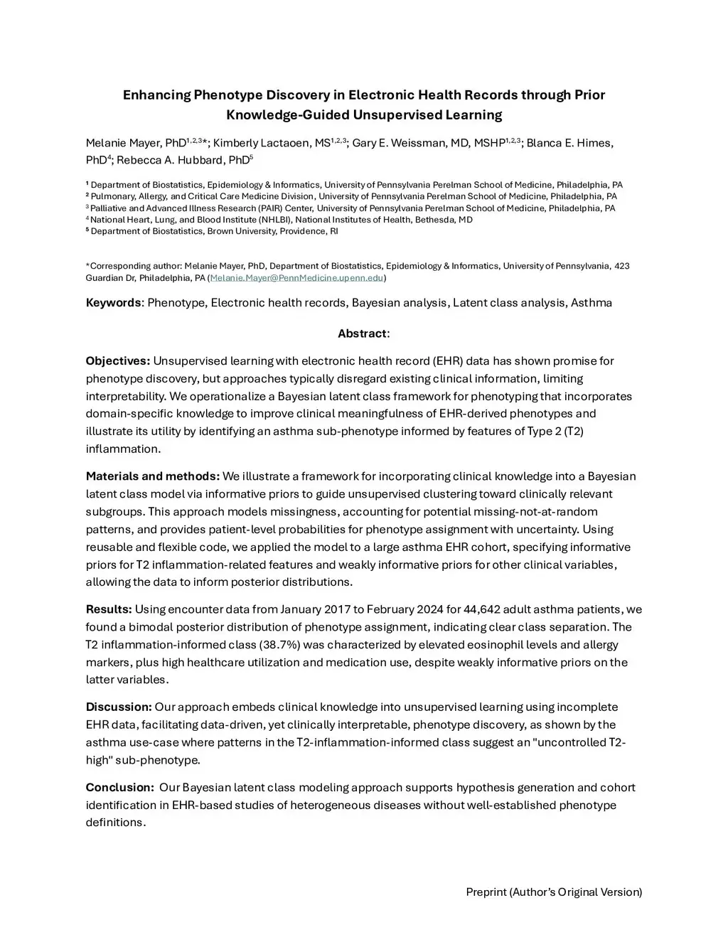 Objectives: Unsupervised learning with electronic health record (EHR) data has shown promise for phenotype discovery, but approaches typically disregard existing clinical information, limiting interpretability. We operationalize a Bayesian latent class framework for phenotyping that incorporates domain-specific knowledge to improve clinical meaningfulness of EHR-derived phenotypes and illustrate its utility by identifying an asthma sub-phenotype informed by features of Type 2 (T2) inflammation.Materials and methods: We illustrate a framework for incorporating clinical knowledge into a Bayesian latent class model via informative priors to guide unsupervised clustering toward clinically relevant subgroups. This approach models missingness, accounting for potential missing-not-at-random patterns, and provides patient-level probabilities for phenotype assignment with uncertainty. Using reusable and flexible code, we applied the model to a large asthma EHR cohort, specifying informative priors for T2 inflammation-related features and weakly informative priors for other clinical variables, allowing the data to inform posterior distributions.Results and Conclusion: Using encounter data from January 2017 to February 2024 for 44,642 adult asthma patients, we found a bimodal posterior distribution of phenotype assignment, indicating clear class separation. The T2 inflammation-informed class (38.7%) was characterized by elevated eosinophil levels and allergy markers, plus high healthcare utilization and medication use, despite weakly informative priors on the latter variables. These patterns suggest an "uncontrolled T2-high" sub-phenotype. This demonstrates how our Bayesian latent class modeling approach supports hypothesis generation and cohort identification in EHR-based studies of heterogeneous diseases without well-established phenotype definitions.