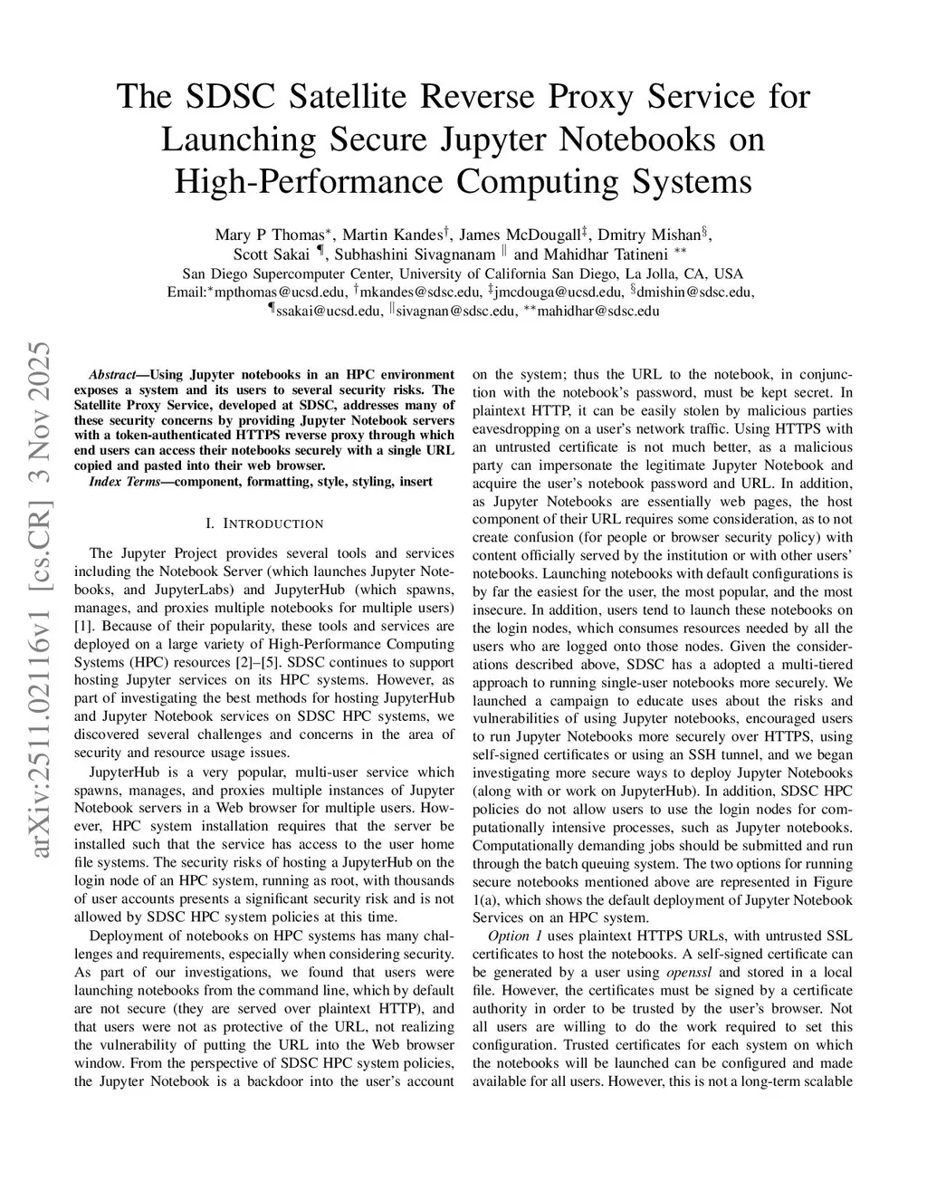 Using Jupyter notebooks in an HPC environment exposes a system and its users to several security risks. The Satellite Proxy Service, developed at SDSC, addresses many of these security concerns by providing Jupyter Notebook servers with a token-authenticated HTTPS reverse proxy through which end users can access their notebooks securely with a single URL copied and pasted into their web browser.