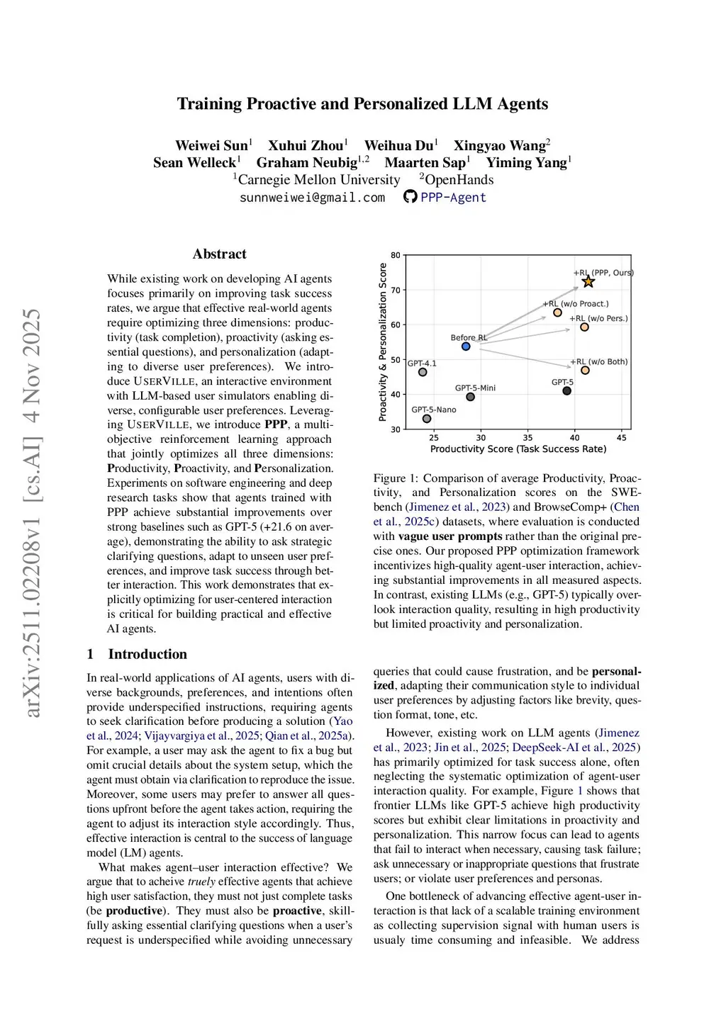 While existing work focuses primarily on task success, we argue that effective real-world agents require optimizing three dimensions: productivity (task completion), proactivity (asking essential questions), and personalization (adapting to diverse user preferences). We introduce UserVille, an interactive environment with LLM-based user simulators enabling diverse, configurable user preferences. Leveraging UserVille, we introduce PPP, a multi-objective reinforcement learning approach that jointly optimizes all three dimensions: Productivity, Proactivity, and Personalization. Experiments on software engineering and deep research tasks show that agents trained with PPP achieve substantial improvements over strong baselines such as GPT-5 (+21.6 on average), demonstrating the ability to ask strategic clarifying questions, adapt to unseen user preferences, and improve task success through better interaction. This work demonstrates that explicitly optimizing for user-centered interaction is critical for building practical and effective AI agents.