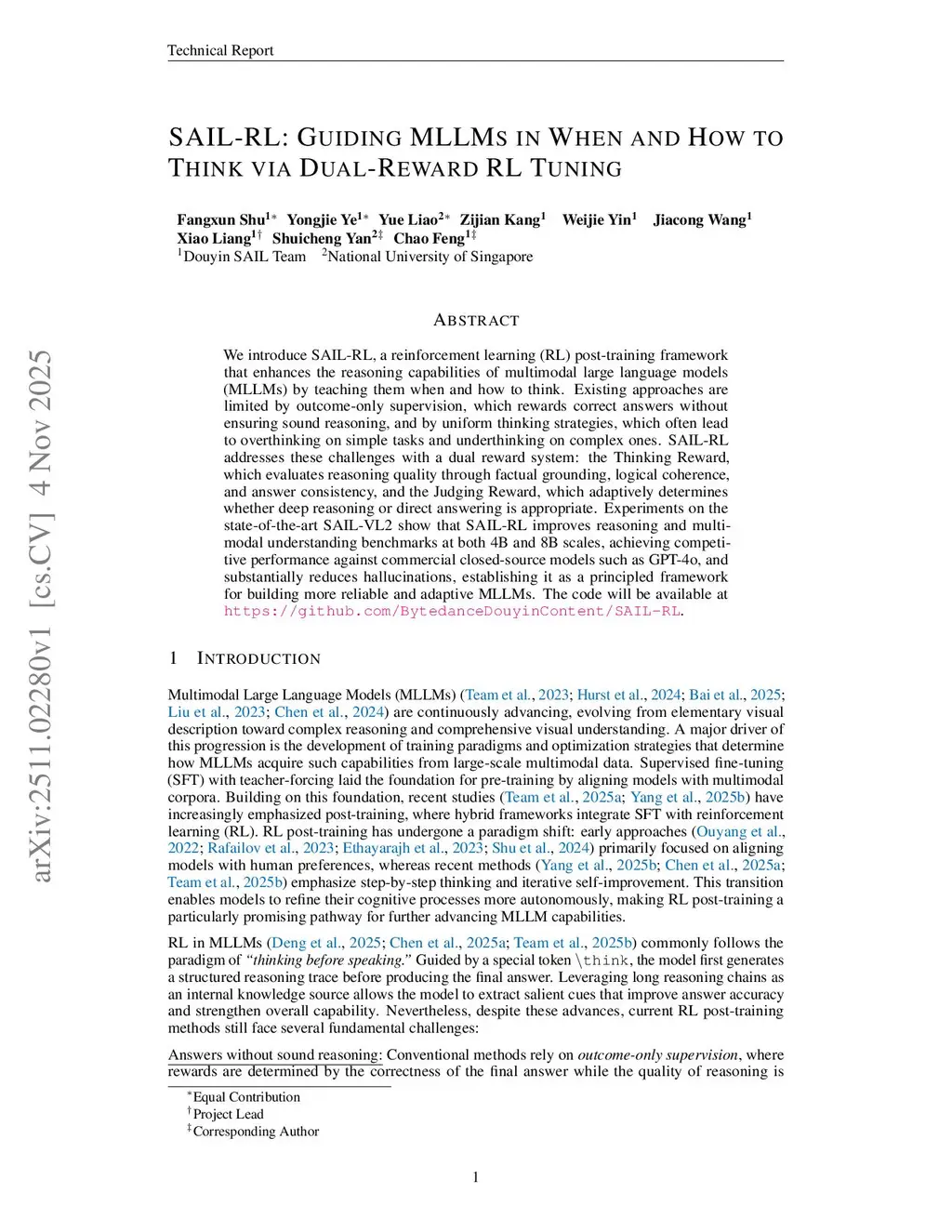 SAIL-RL: Guiding MLLMs in When and How to Think via Dual-Reward RL Tuning