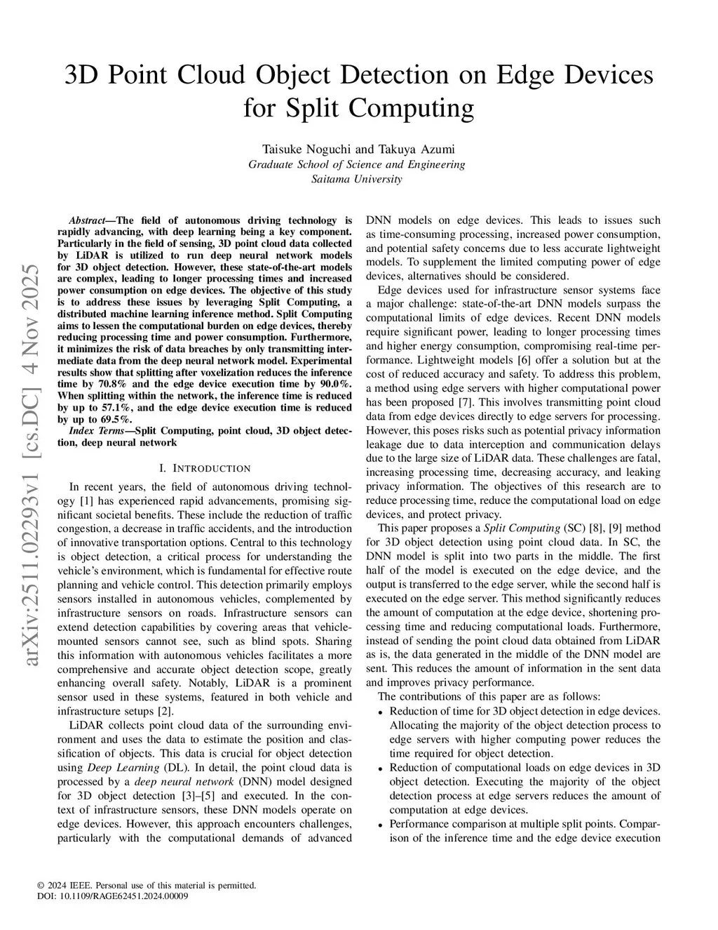 The field of autonomous driving technology is rapidly advancing, with deep learning being a key component. Particularly in the field of sensing, 3D point cloud data collected by LiDAR is utilized to run deep neural network models for 3D object detection. However, these state-of-the-art models are complex, leading to longer processing times and increased power consumption on edge devices. The objective of this study is to address these issues by leveraging Split Computing, a distributed machine learning inference method. Split Computing aims to lessen the computational burden on edge devices, thereby reducing processing time and power consumption. Furthermore, it minimizes the risk of data breaches by only transmitting intermediate data from the deep neural network model. Experimental results show that splitting after voxelization reduces the inference time by 70.8% and the edge device execution time by 90.0%. When splitting within the network, the inference time is reduced by up to 57.1%, and the edge device execution time is reduced by up to 69.5%.