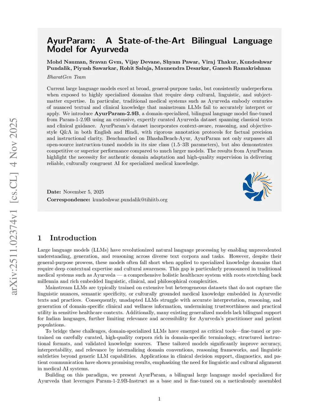 Current large language models excel at broad, general-purpose tasks, but consistently underperform when exposed to highly specialized domains that require deep cultural, linguistic, and subject-matter expertise. In particular, traditional medical systems such as Ayurveda embody centuries of nuanced textual and clinical knowledge that mainstream LLMs fail to accurately interpret or apply. We introduce AyurParam-2.9B, a domain-specialized, bilingual language model fine-tuned from Param-1-2.9B using an extensive, expertly curated Ayurveda dataset spanning classical texts and clinical guidance. AyurParam's dataset incorporates context-aware, reasoning, and objective-style Q&A in both English and Hindi, with rigorous annotation protocols for factual precision and instructional clarity. Benchmarked on BhashaBench-Ayur, AyurParam not only surpasses all open-source instruction-tuned models in its size class (1.5--3B parameters), but also demonstrates competitive or superior performance compared to much larger models. The results from AyurParam highlight the necessity for authentic domain adaptation and high-quality supervision in delivering reliable, culturally congruent AI for specialized medical knowledge.