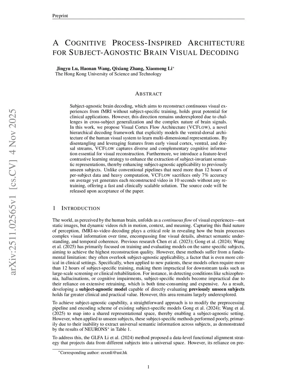Subject-agnostic brain decoding, which aims to reconstruct continuous visual experiences from fMRI without subject-specific training, holds great potential for clinical applications. However, this direction remains underexplored due to challenges in cross-subject generalization and the complex nature of brain signals. In this work, we propose Visual Cortex Flow Architecture (VCFlow), a novel hierarchical decoding framework that explicitly models the ventral-dorsal architecture of the human visual system to learn multi-dimensional representations. By disentangling and leveraging features from early visual cortex, ventral, and dorsal streams, VCFlow captures diverse and complementary cognitive information essential for visual reconstruction. Furthermore, we introduce a feature-level contrastive learning strategy to enhance the extraction of subject-invariant semantic representations, thereby enhancing subject-agnostic applicability to previously unseen subjects. Unlike conventional pipelines that need more than 12 hours of per-subject data and heavy computation, VCFlow sacrifices only 7\% accuracy on average yet generates each reconstructed video in 10 seconds without any retraining, offering a fast and clinically scalable solution. The source code will be released upon acceptance of the paper.