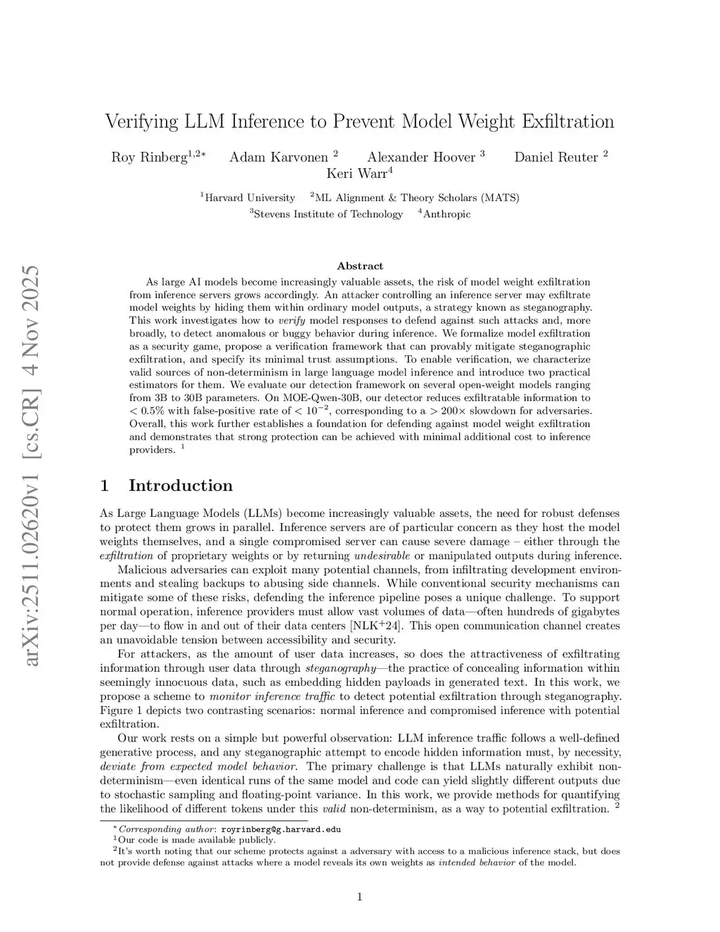 As large AI models become increasingly valuable assets, the risk of model weight exfiltration from inference servers grows accordingly. An attacker controlling an inference server may exfiltrate model weights by hiding them within ordinary model outputs, a strategy known as steganography. This work investigates how to verify model responses to defend against such attacks and, more broadly, to detect anomalous or buggy behavior during inference. We formalize model exfiltration as a security game, propose a verification framework that can provably mitigate steganographic exfiltration, and specify the trust assumptions associated with our scheme. To enable verification, we characterize valid sources of non-determinism in large language model inference and introduce two practical estimators for them. We evaluate our detection framework on several open-weight models ranging from 3B to 30B parameters. On MOE-Qwen-30B, our detector reduces exfiltratable information to <0.5% with false-positive rate of 0.01%, corresponding to a >200x slowdown for adversaries. Overall, this work further establishes a foundation for defending against model weight exfiltration and demonstrates that strong protection can be achieved with minimal additional cost to inference providers.