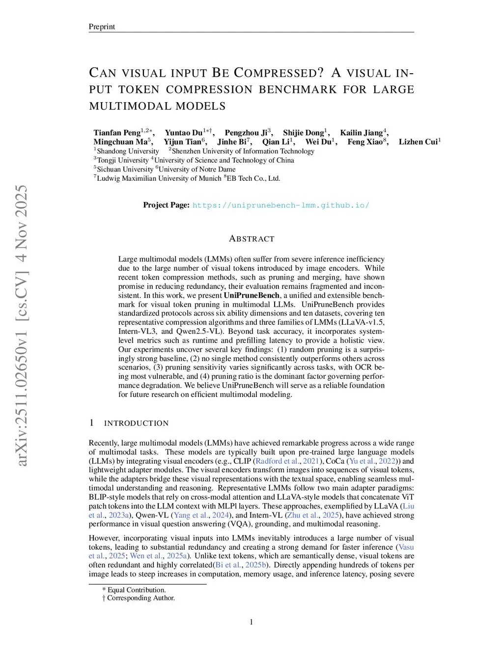 Large multimodal models (LMMs) often suffer from severe inference inefficiency due to the large number of visual tokens introduced by image encoders. While recent token compression methods, such as pruning and merging, have shown promise in reducing redundancy, their evaluation remains fragmented and inconsistent. In this work, we present UniPruneBench, a unified and extensible benchmark for visual token pruning in multimodal LLMs. UniPruneBench provides standardized protocols across six ability dimensions and ten datasets, covering ten representative compression algorithms and three families of LMMs (LLaVA-v1.5, Intern-VL3, and Qwen2.5-VL). Beyond task accuracy, it incorporates system-level metrics such as runtime and prefilling latency to provide a holistic view. Our experiments uncover several key findings: (1) random pruning is a surprisingly strong baseline, (2) no single method consistently outperforms others across scenarios, (3) pruning sensitivity varies significantly across tasks, with OCR being most vulnerable, and (4) pruning ratio is the dominant factor governing performance degradation. We believe UniPruneBench will serve as a reliable foundation for future research on efficient multimodal modeling.
