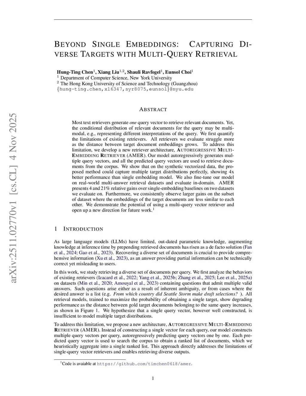 Most text retrievers generate \emph{one} query vector to retrieve relevant documents. Yet, the conditional distribution of relevant documents for the query may be multimodal, e.g., representing different interpretations of the query. We first quantify the limitations of existing retrievers. All retrievers we evaluate struggle more as the distance between target document embeddings grows. To address this limitation, we develop a new retriever architecture, \emph{A}utoregressive \emph{M}ulti-\emph{E}mbedding \emph{R}etriever (AMER). Our model autoregressively generates multiple query vectors, and all the predicted query vectors are used to retrieve documents from the corpus. We show that on the synthetic vectorized data, the proposed method could capture multiple target distributions perfectly, showing 4x better performance than single embedding model. We also fine-tune our model on real-world multi-answer retrieval datasets and evaluate in-domain. AMER presents 4 and 21\% relative gains over single-embedding baselines on two datasets we evaluate on. Furthermore, we consistently observe larger gains on the subset of dataset where the embeddings of the target documents are less similar to each other. We demonstrate the potential of using a multi-query vector retriever and open up a new direction for future work.