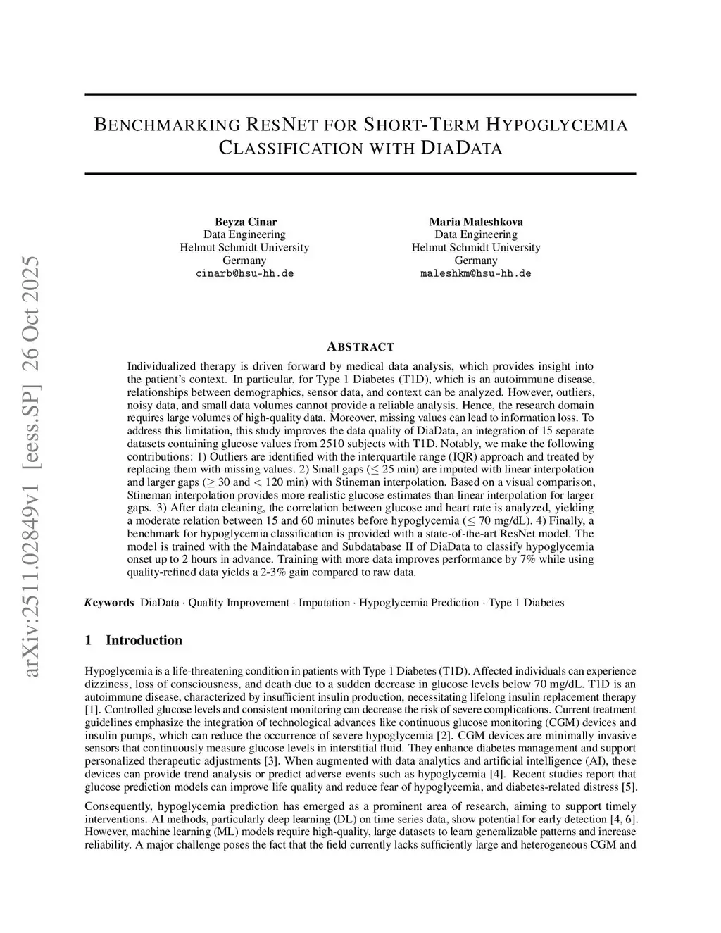 Benchmarking ResNet for Short-Term Hypoglycemia Classification with DiaData