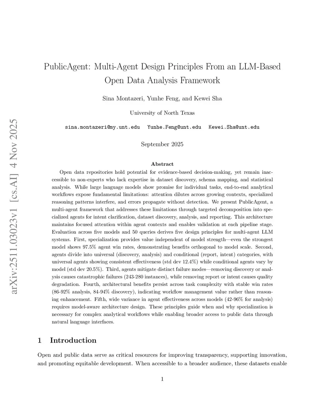 Open data repositories hold potential for evidence-based decision-making, yet are inaccessible to non-experts lacking expertise in dataset discovery, schema mapping, and statistical analysis. Large language models show promise for individual tasks, but end-to-end analytical workflows expose fundamental limitations: attention dilutes across growing contexts, specialized reasoning patterns interfere, and errors propagate undetected. We present PublicAgent, a multi-agent framework that addresses these limitations through decomposition into specialized agents for intent clarification, dataset discovery, analysis, and reporting. This architecture maintains focused attention within agent contexts and enables validation at each stage. Evaluation across five models and 50 queries derives five design principles for multi-agent LLM systems. First, specialization provides value independent of model strength--even the strongest model shows 97.5% agent win rates, with benefits orthogonal to model scale. Second, agents divide into universal (discovery, analysis) and conditional (report, intent) categories. Universal agents show consistent effectiveness (std dev 12.4%) while conditional agents vary by model (std dev 20.5%). Third, agents mitigate distinct failure modes--removing discovery or analysis causes catastrophic failures (243-280 instances), while removing report or intent causes quality degradation. Fourth, architectural benefits persist across task complexity with stable win rates (86-92% analysis, 84-94% discovery), indicating workflow management value rather than reasoning enhancement. Fifth, wide variance in agent effectiveness across models (42-96% for analysis) requires model-aware architecture design. These principles guide when and why specialization is necessary for complex analytical workflows while enabling broader access to public data through natural language interfaces.