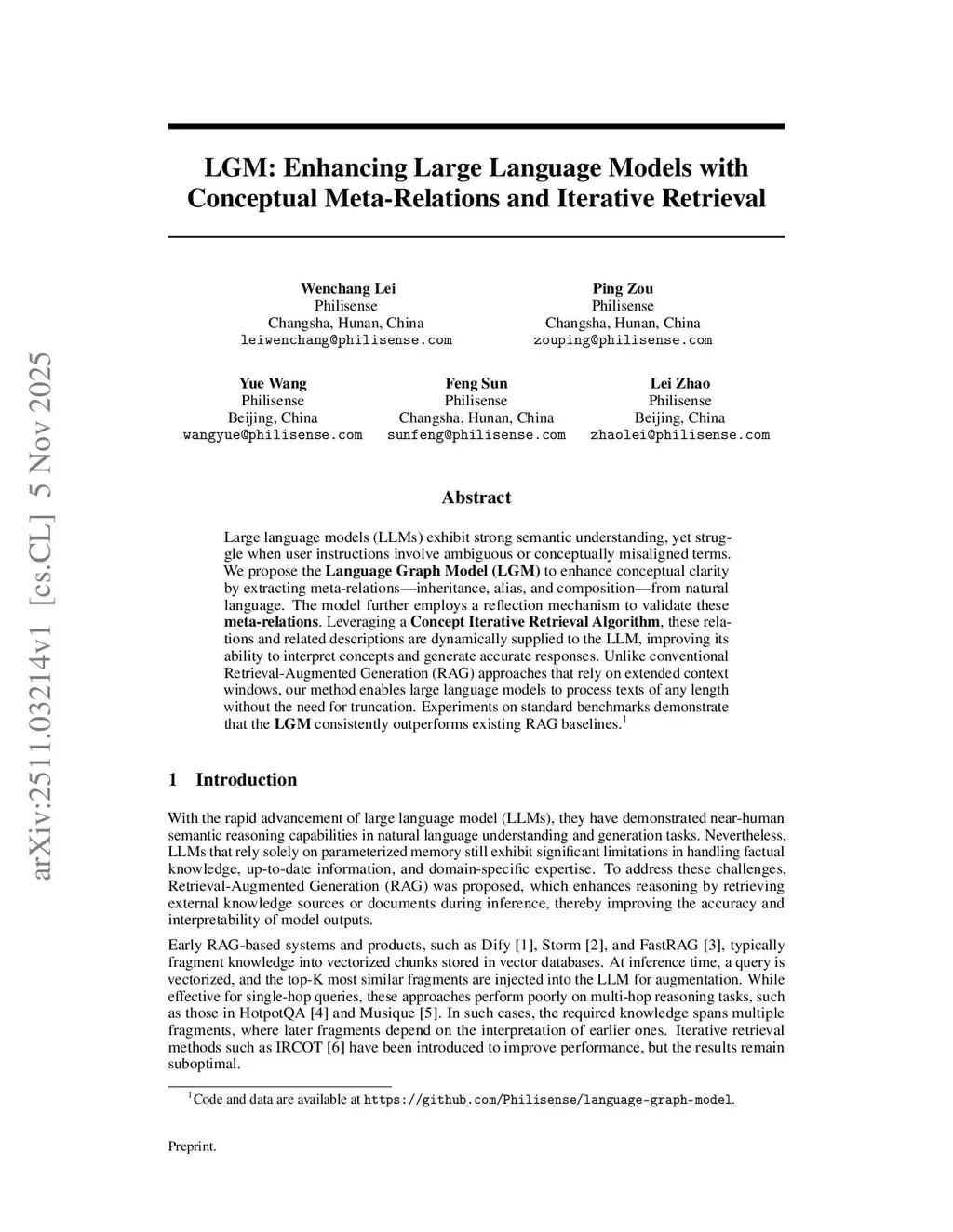 Large language models (LLMs) exhibit strong semantic understanding, yet struggle when user instructions involve ambiguous or conceptually misaligned terms. We propose the Language Graph Model (LGM) to enhance conceptual clarity by extracting meta-relations-inheritance, alias, and composition-from natural language. The model further employs a reflection mechanism to validate these meta-relations. Leveraging a Concept Iterative Retrieval Algorithm, these relations and related descriptions are dynamically supplied to the LLM, improving its ability to interpret concepts and generate accurate responses. Unlike conventional Retrieval-Augmented Generation (RAG) approaches that rely on extended context windows, our method enables large language models to process texts of any length without the need for truncation. Experiments on standard benchmarks demonstrate that the LGM consistently outperforms existing RAG baselines.